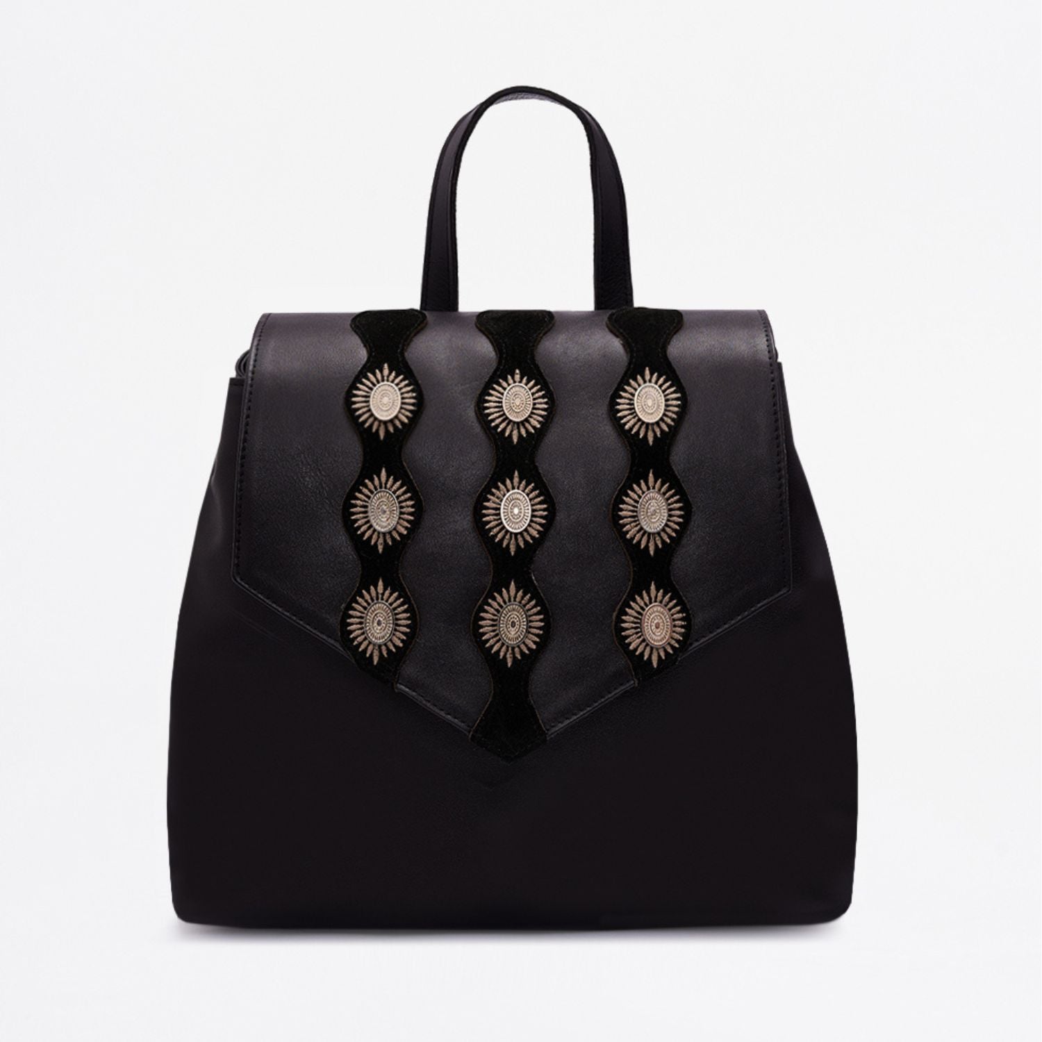 Sculptural top-handle silhouette with secure flap; holds shape and anchors tailored looks.
