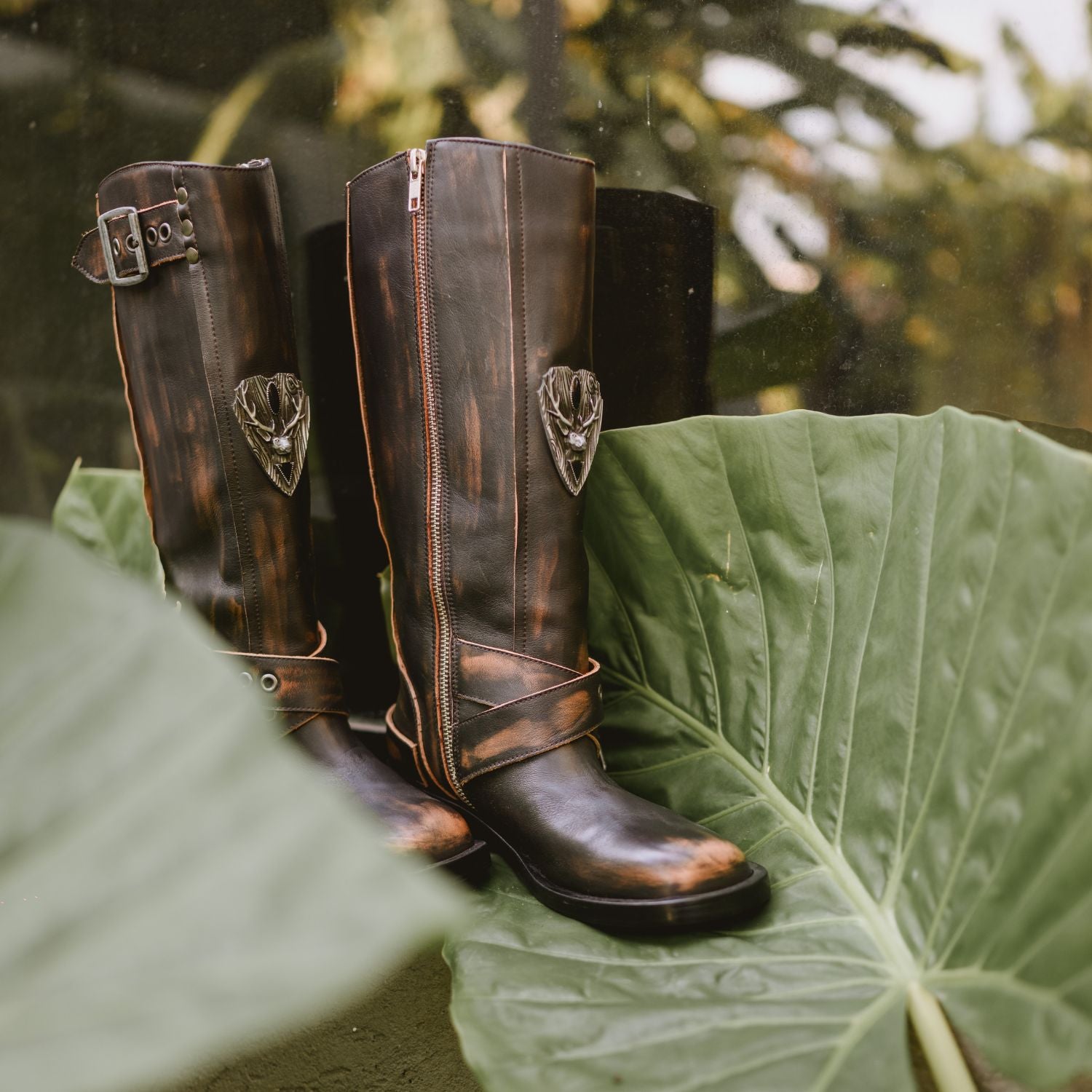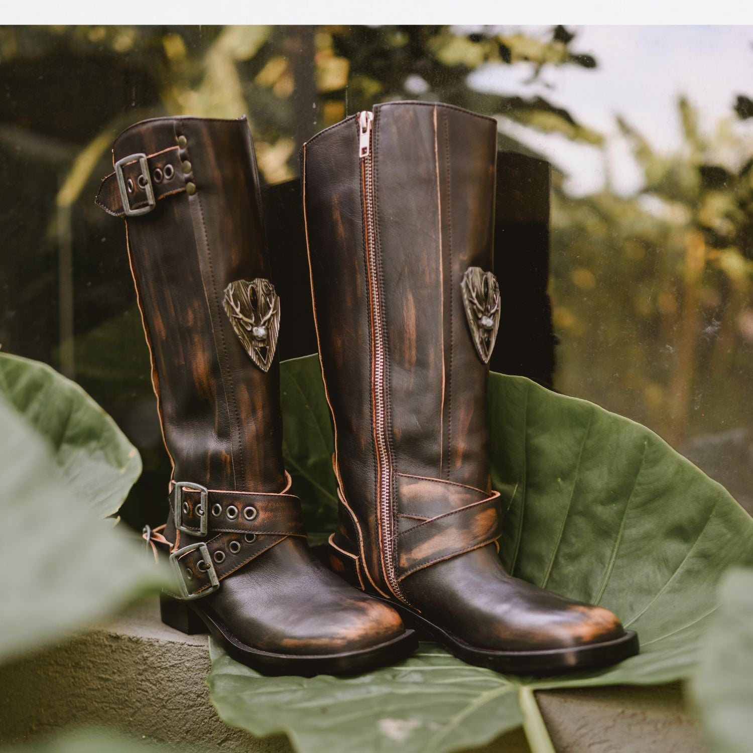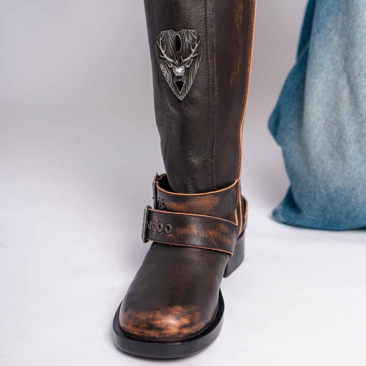 The "Fatal Attraction" knee-high boot is a daring statement piece with edgy metallic details. Available in Black, it’s perfect for rebellious spirits.