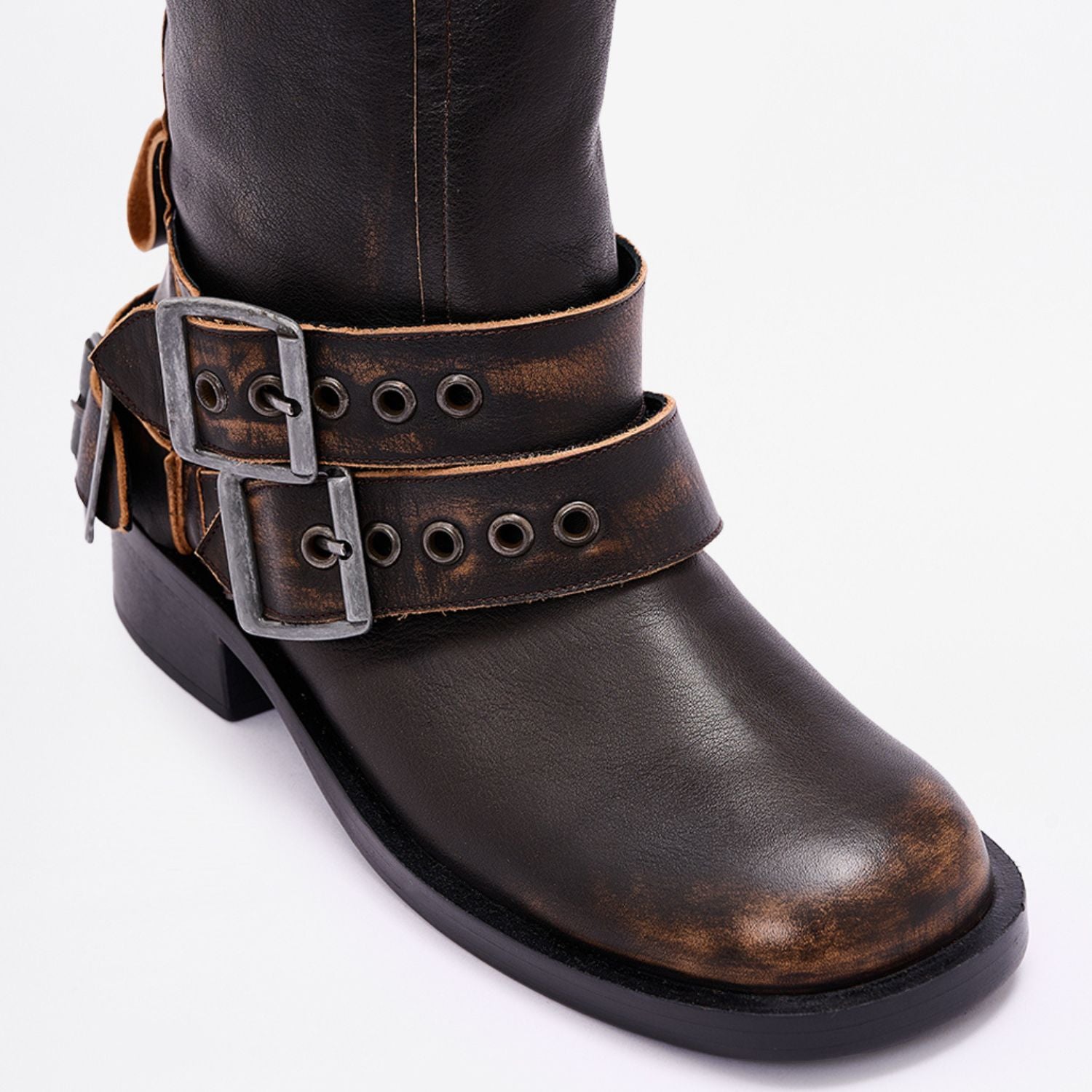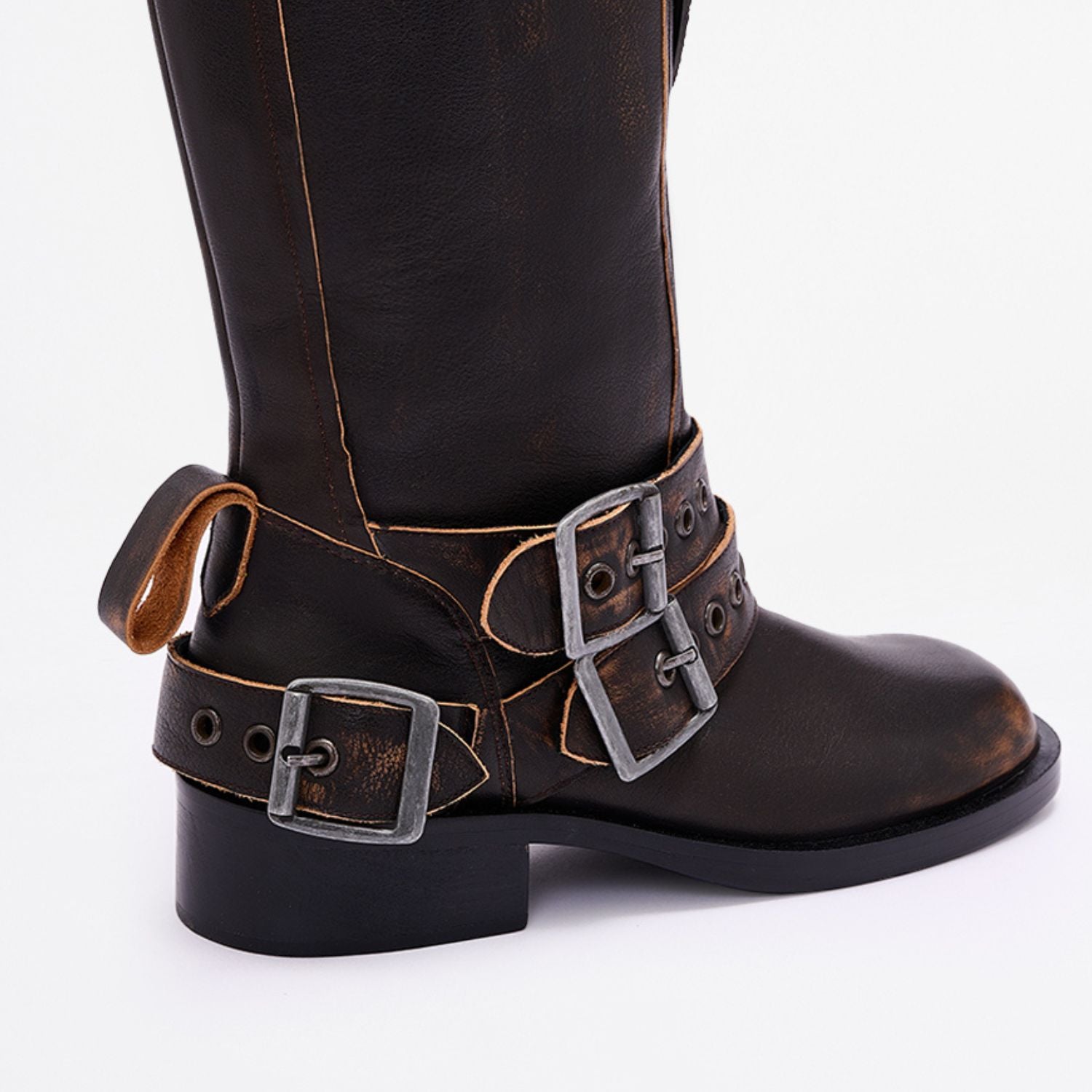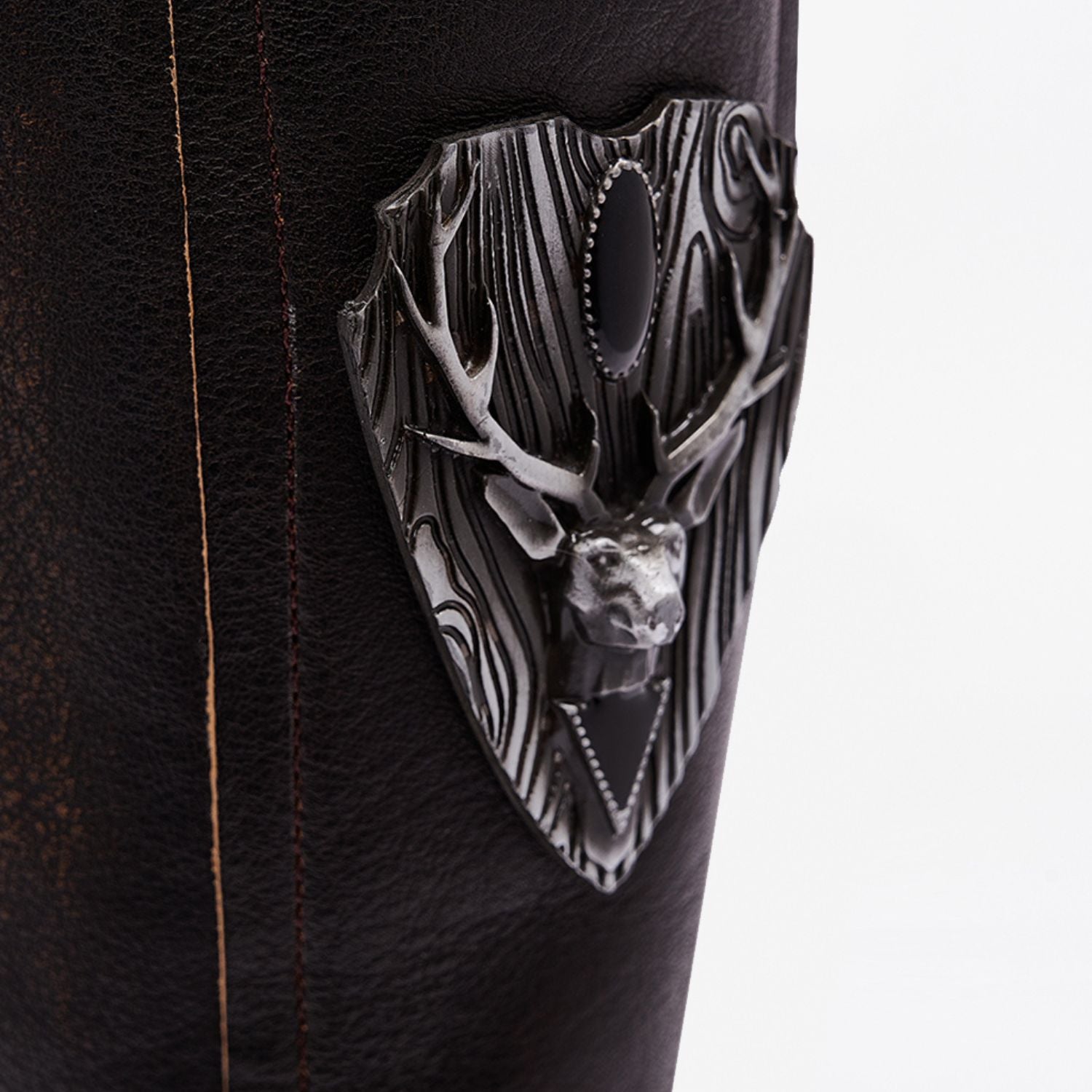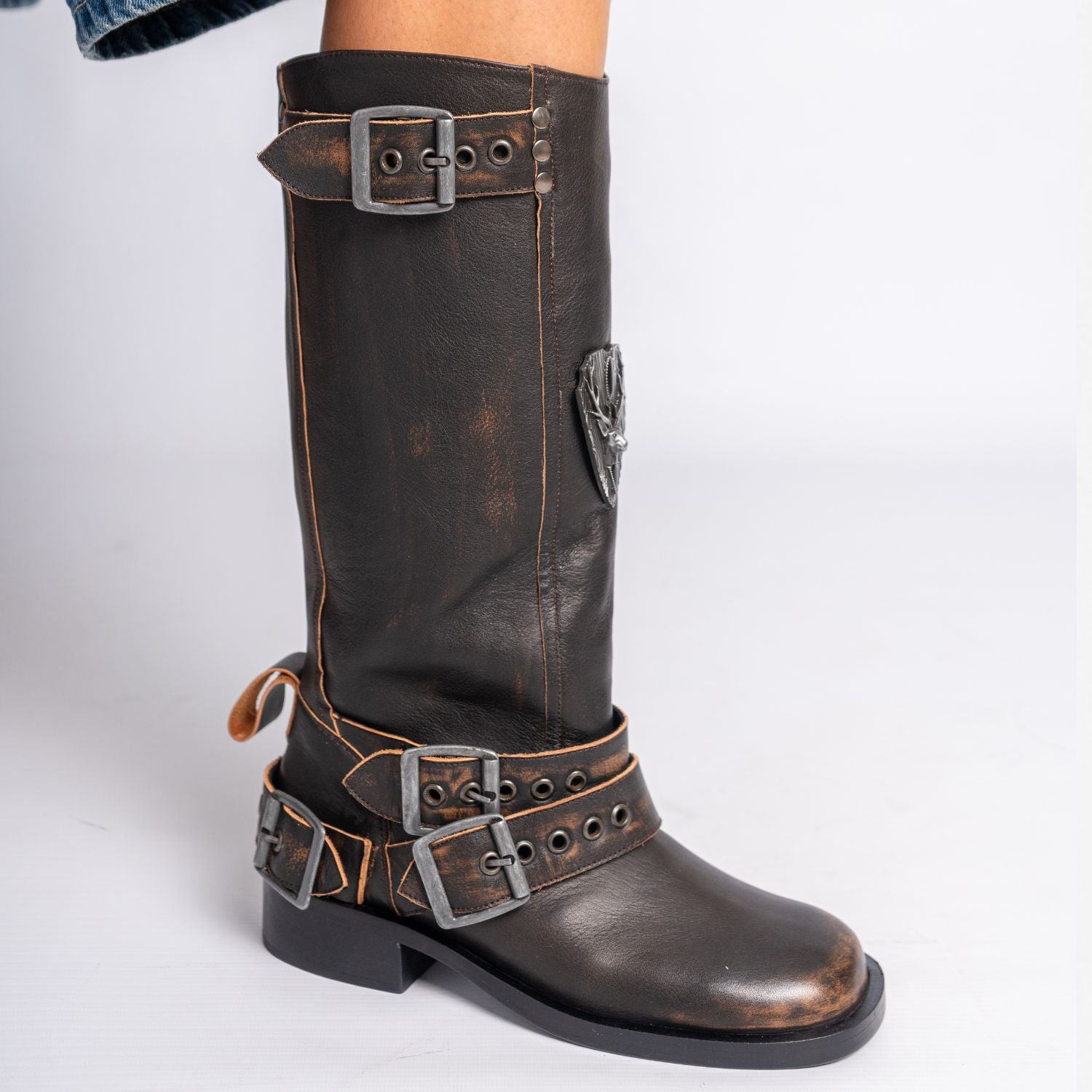 The "Fatal Attraction" knee-high boot is a daring statement piece with edgy metallic details. Available in Black, it’s perfect for rebellious spirits.