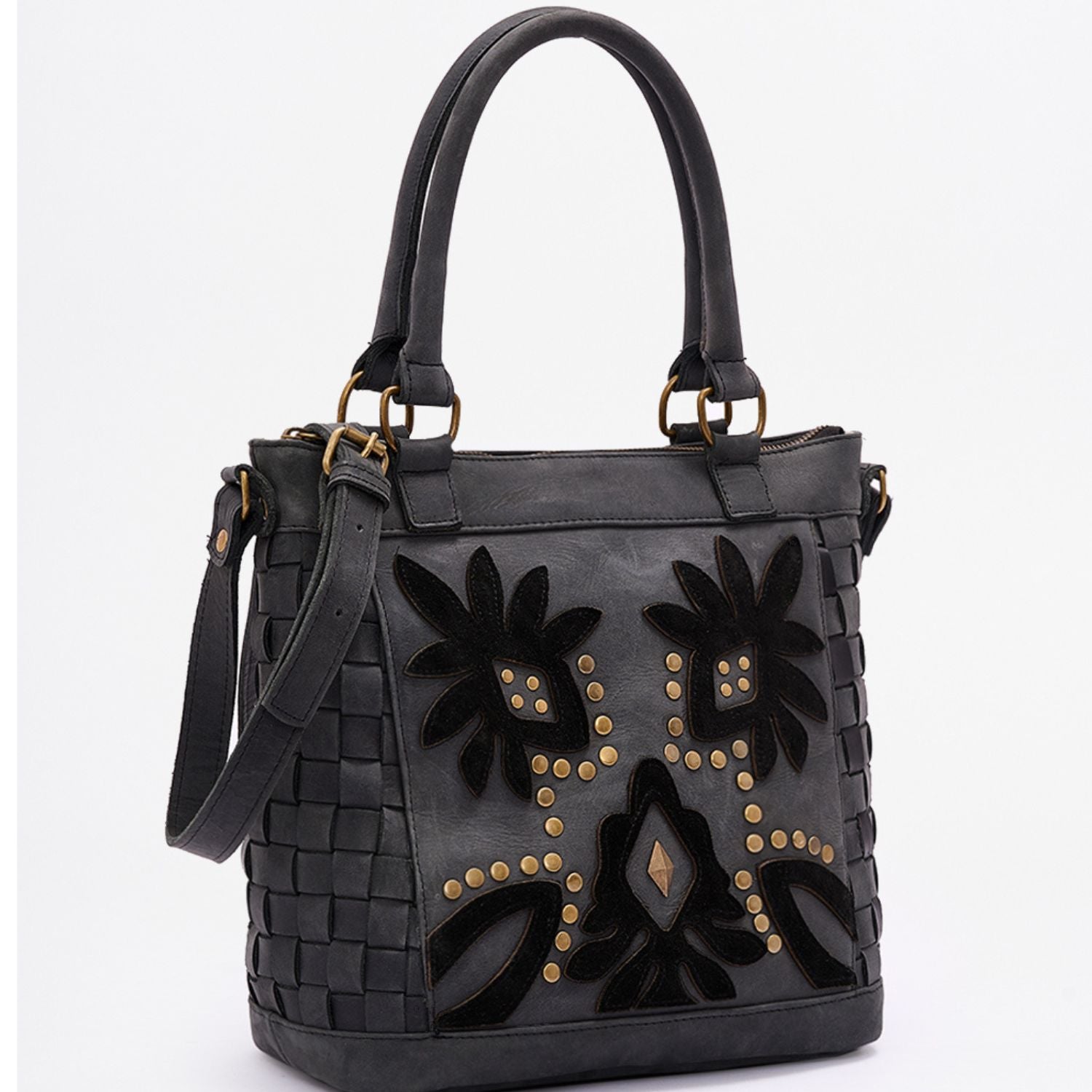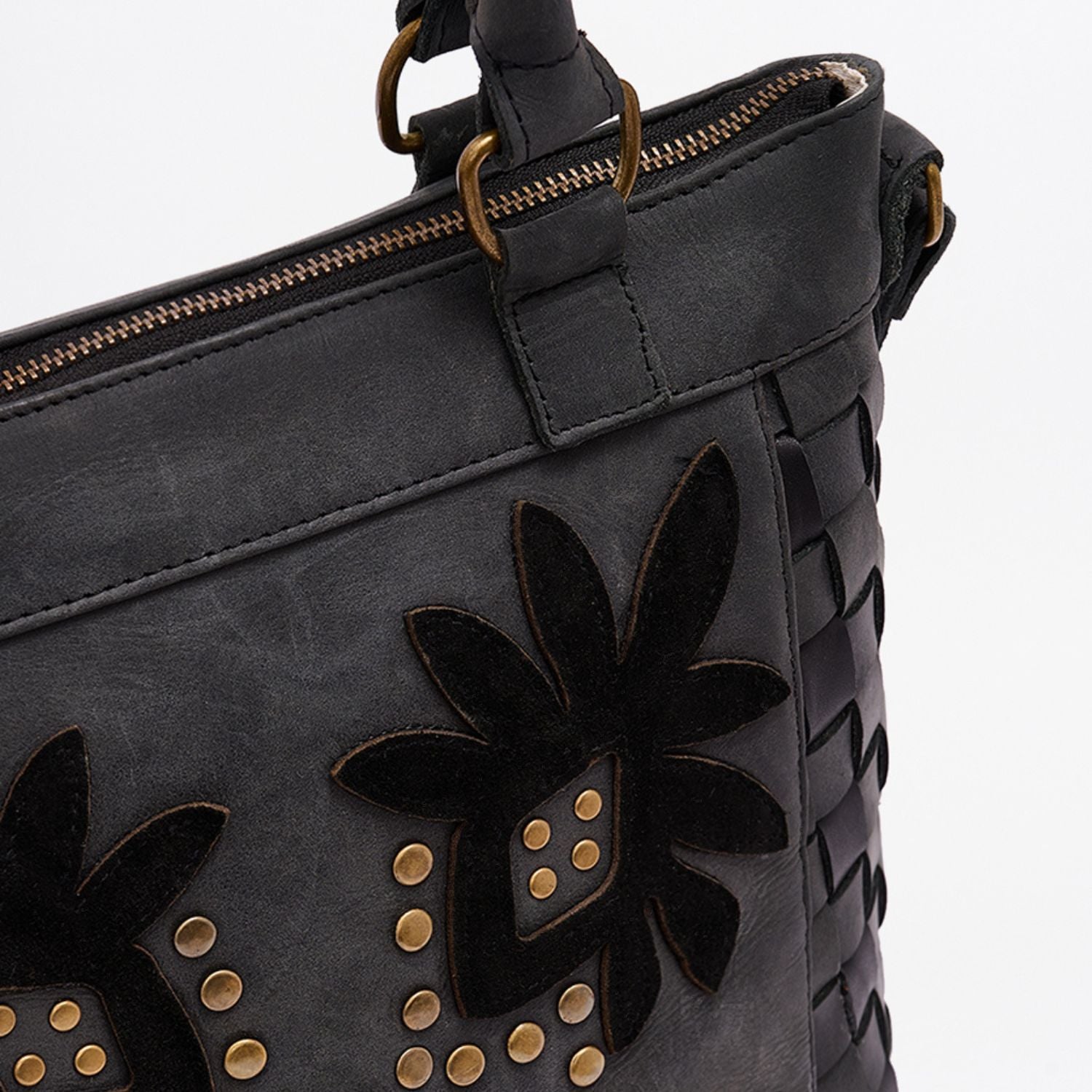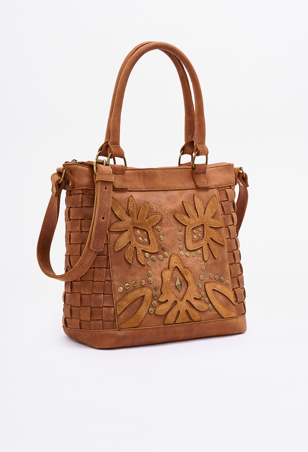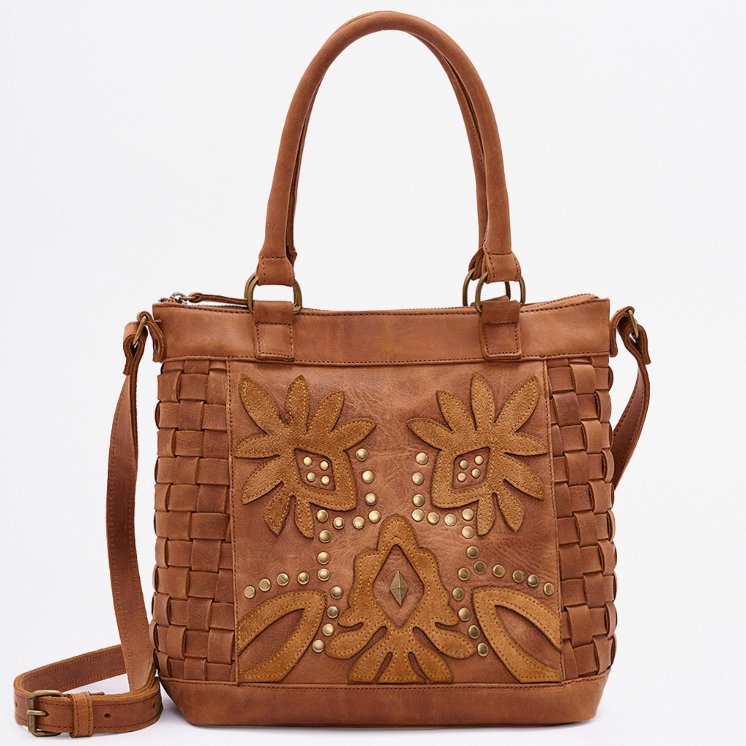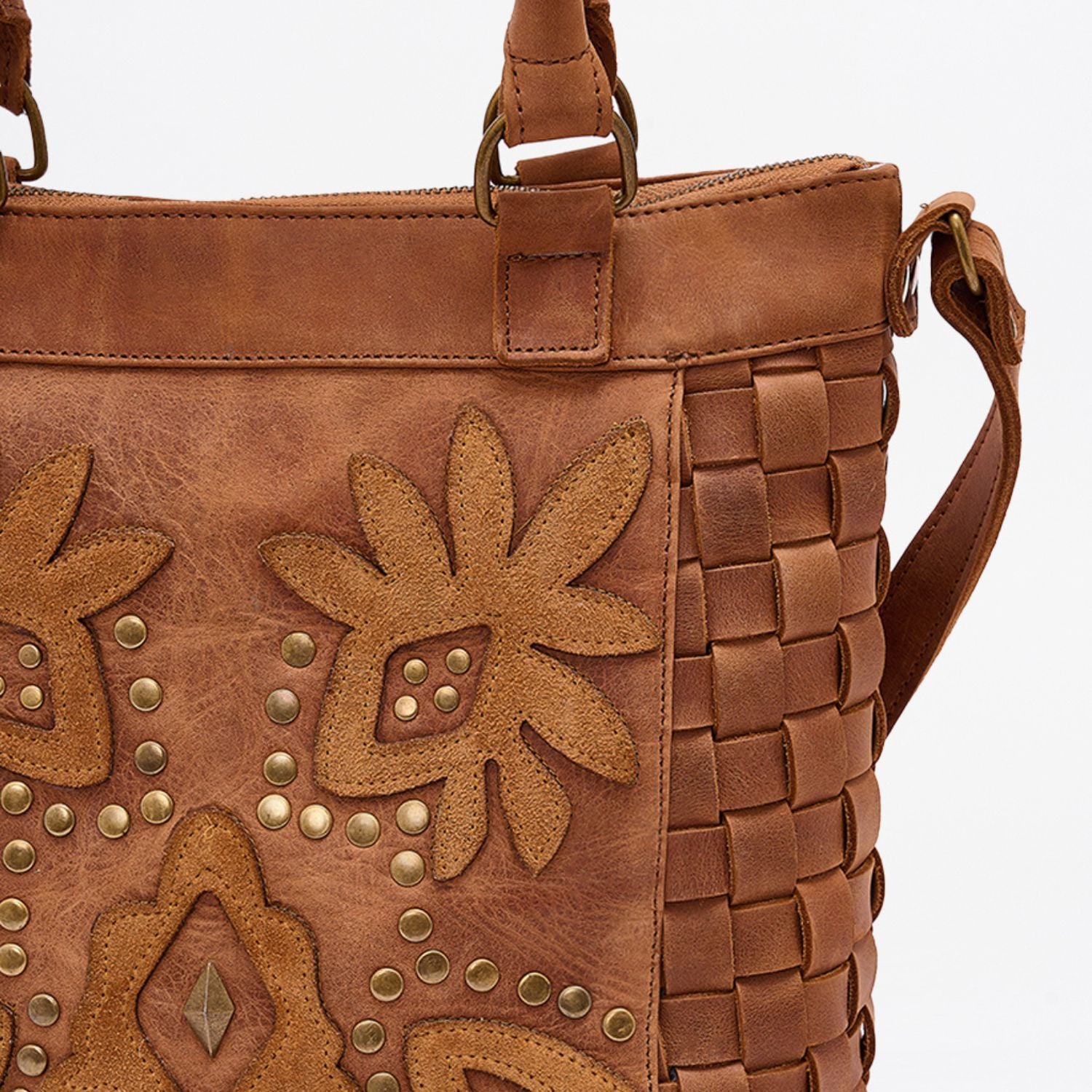 Carry-more silhouette that stays light on the shoulder. Woven panels flex; floral appliqué adds signature Clara detail.
