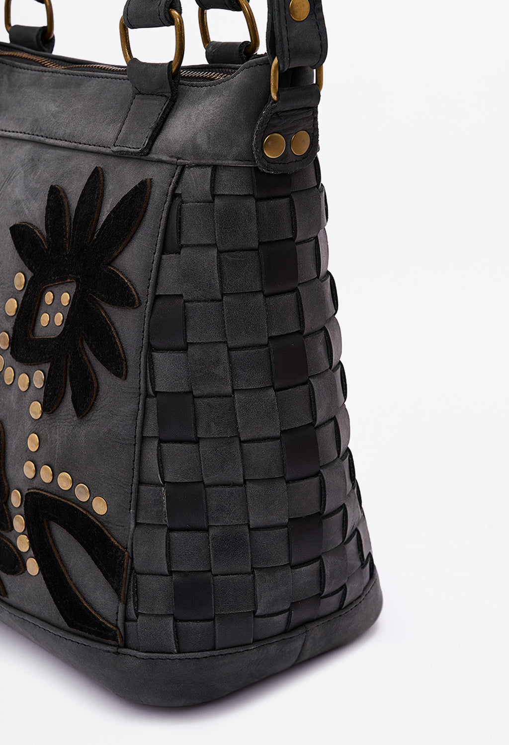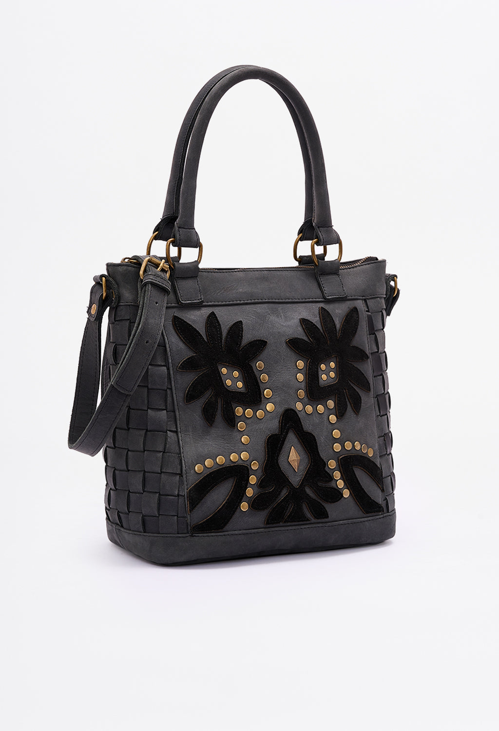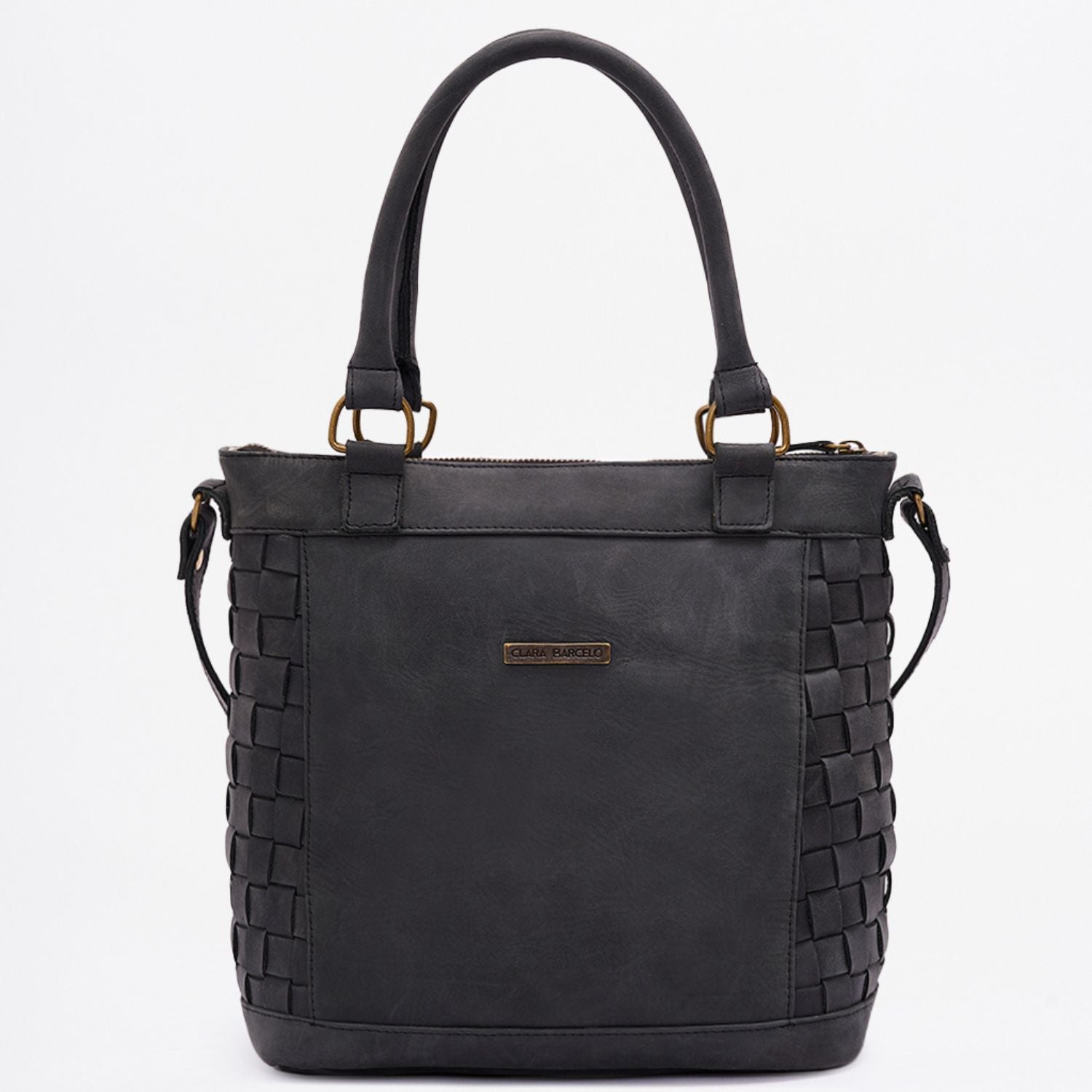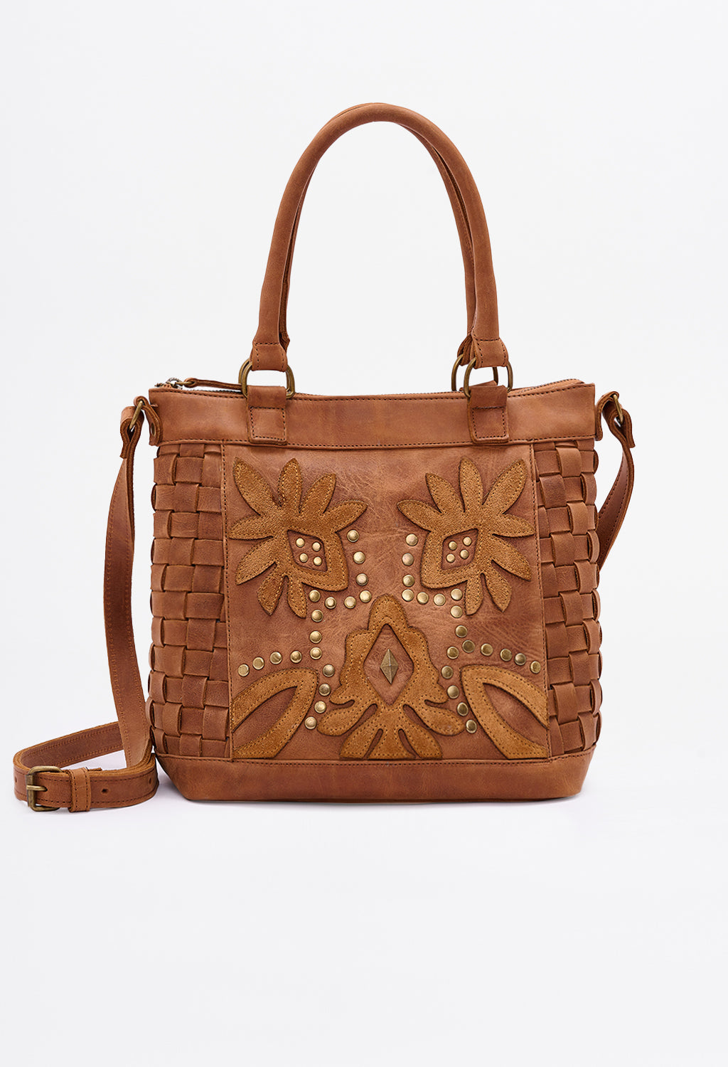 Carry-more silhouette that stays light on the shoulder. Woven panels flex; floral appliqué adds signature Clara detail.