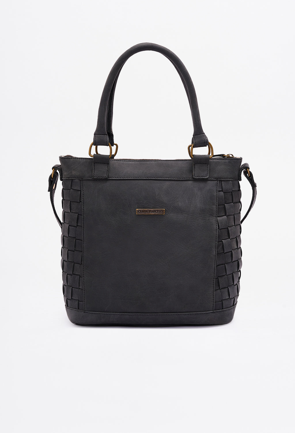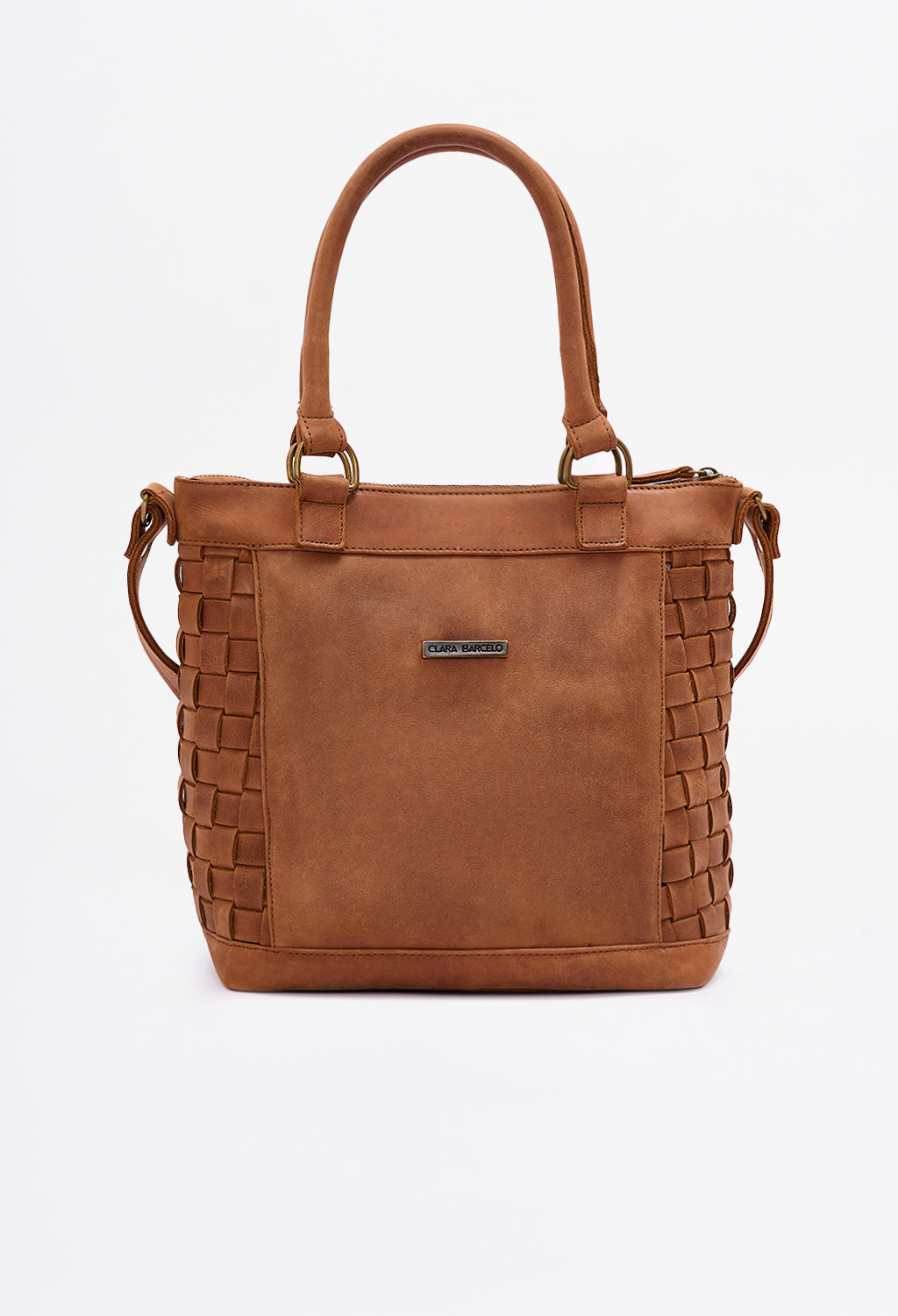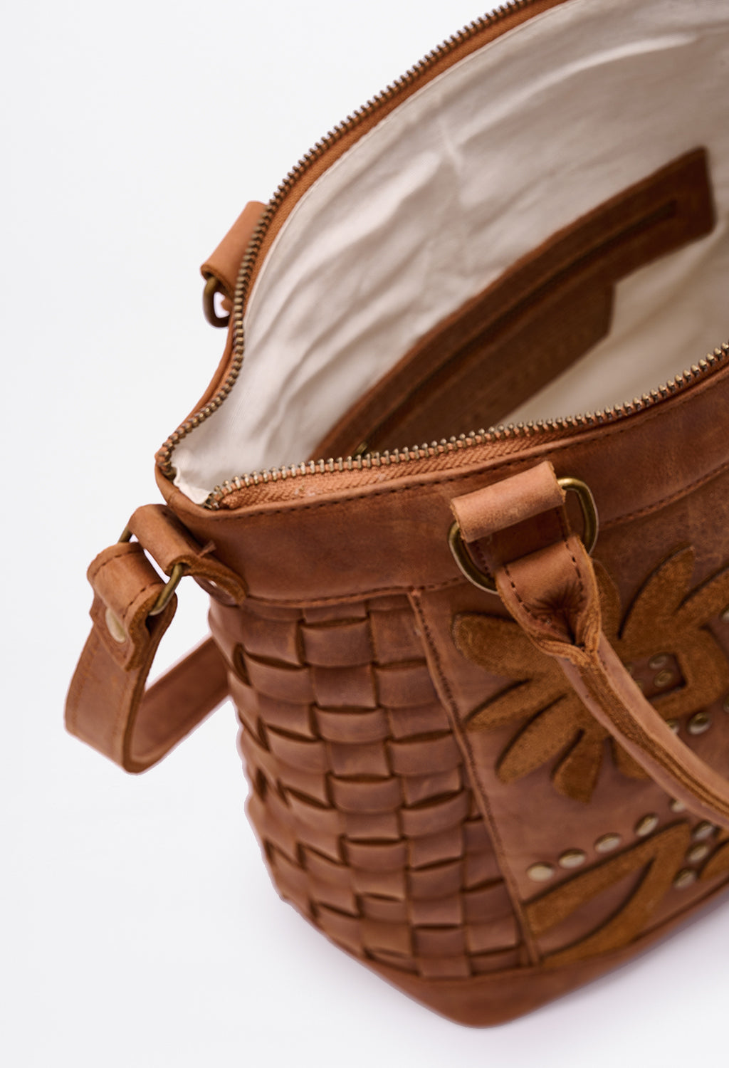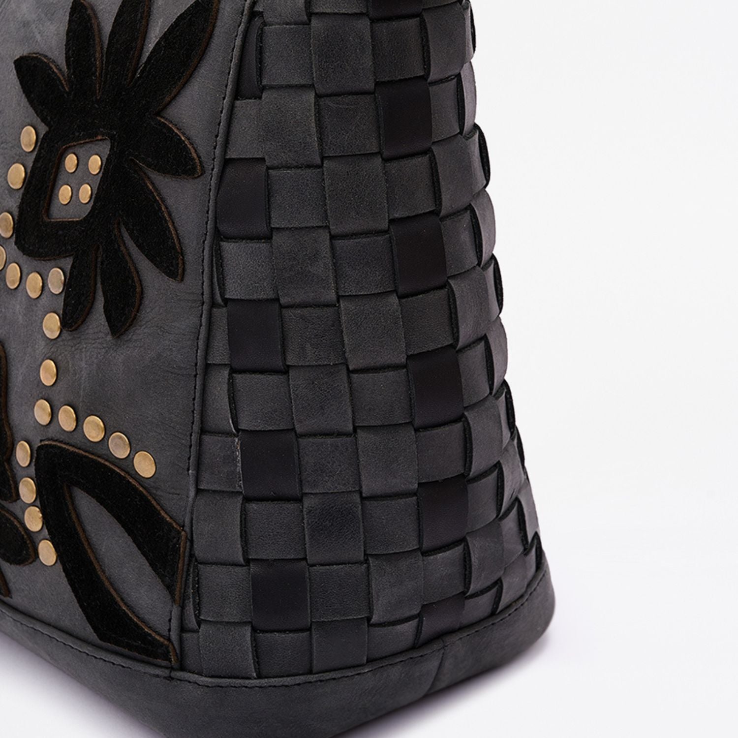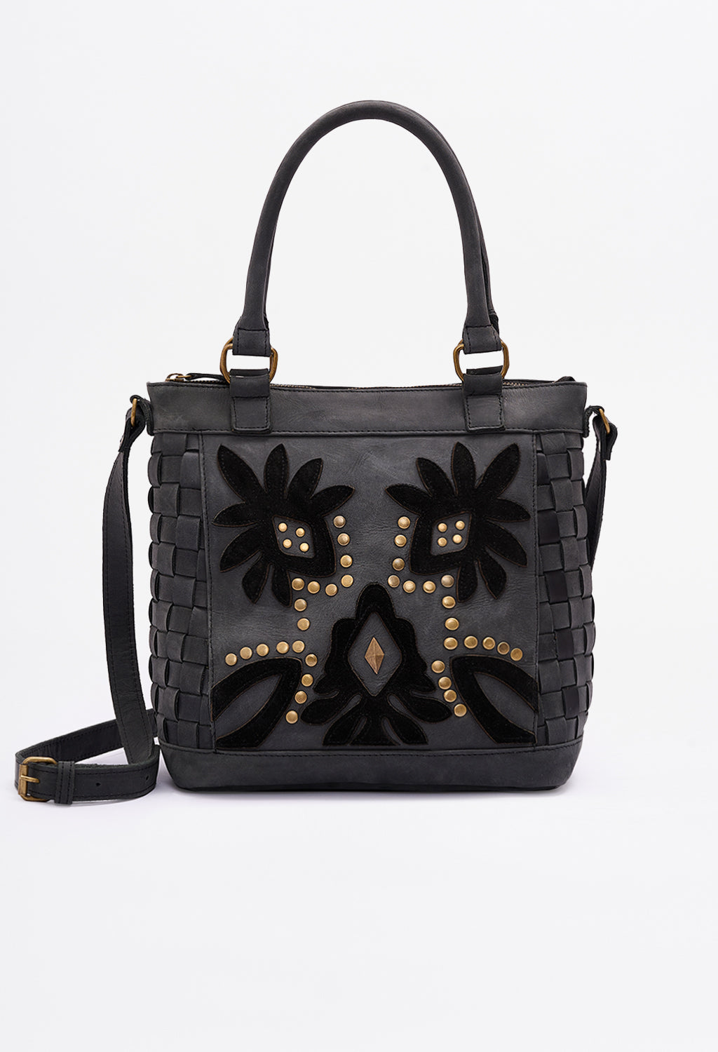 Carry-more silhouette that stays light on the shoulder. Woven panels flex; floral appliqué adds signature Clara detail.