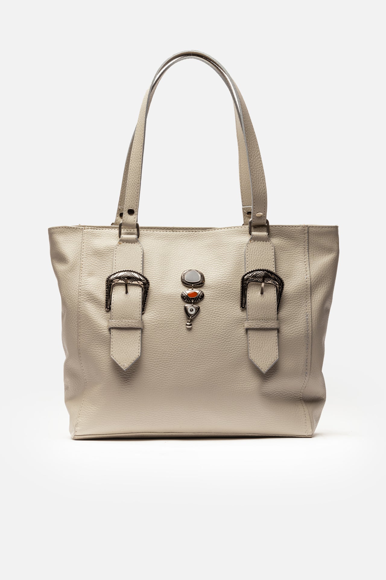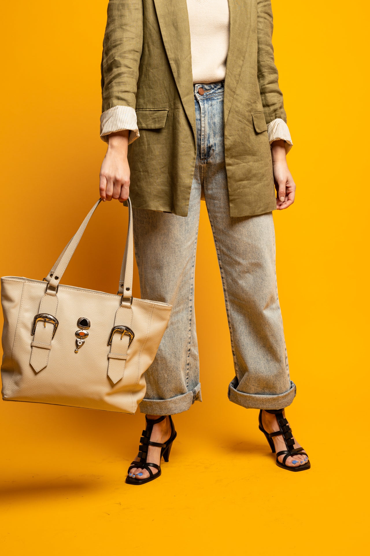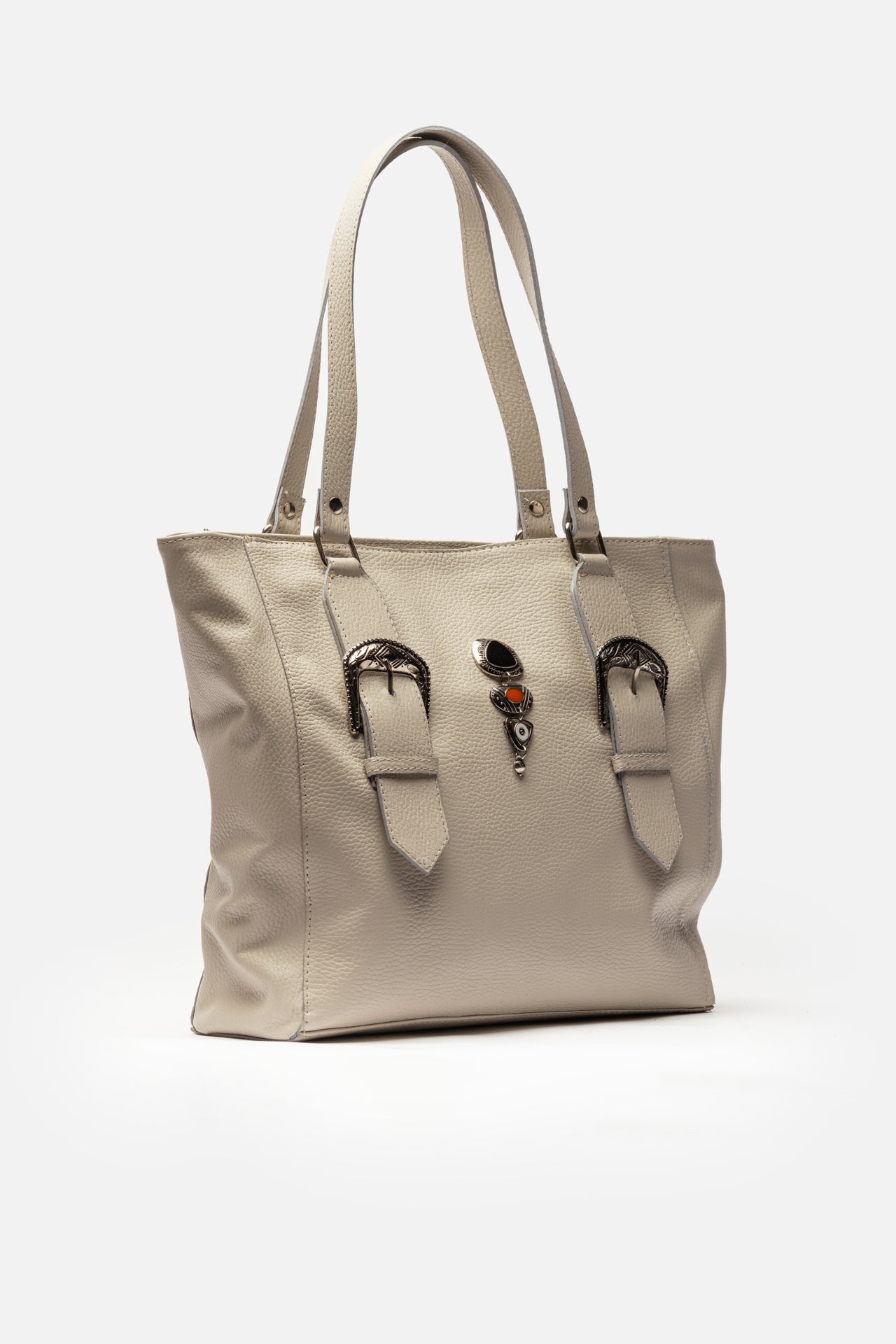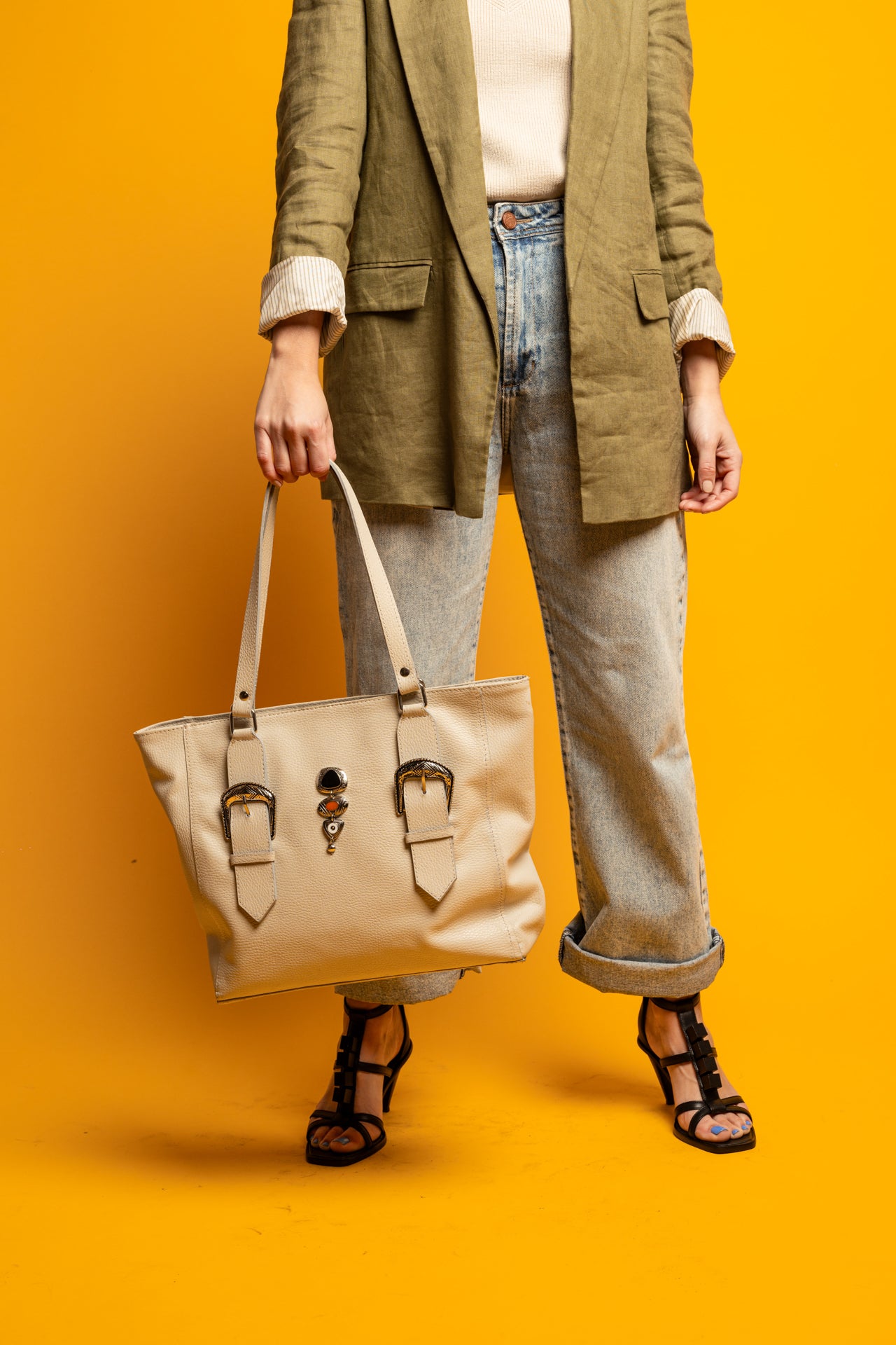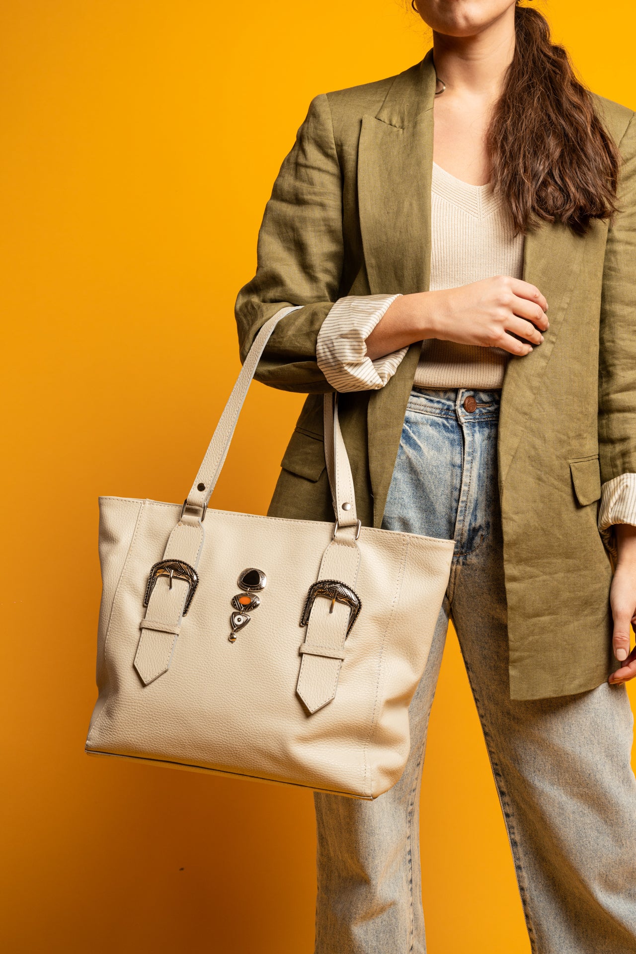Crafted from premium leather with distinctive dual-buckle accents, spacious interior, and sturdy handles for everyday durability.