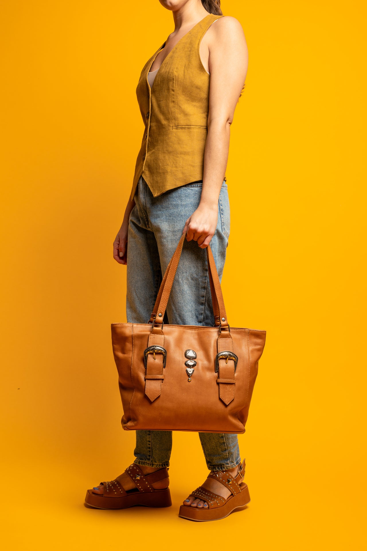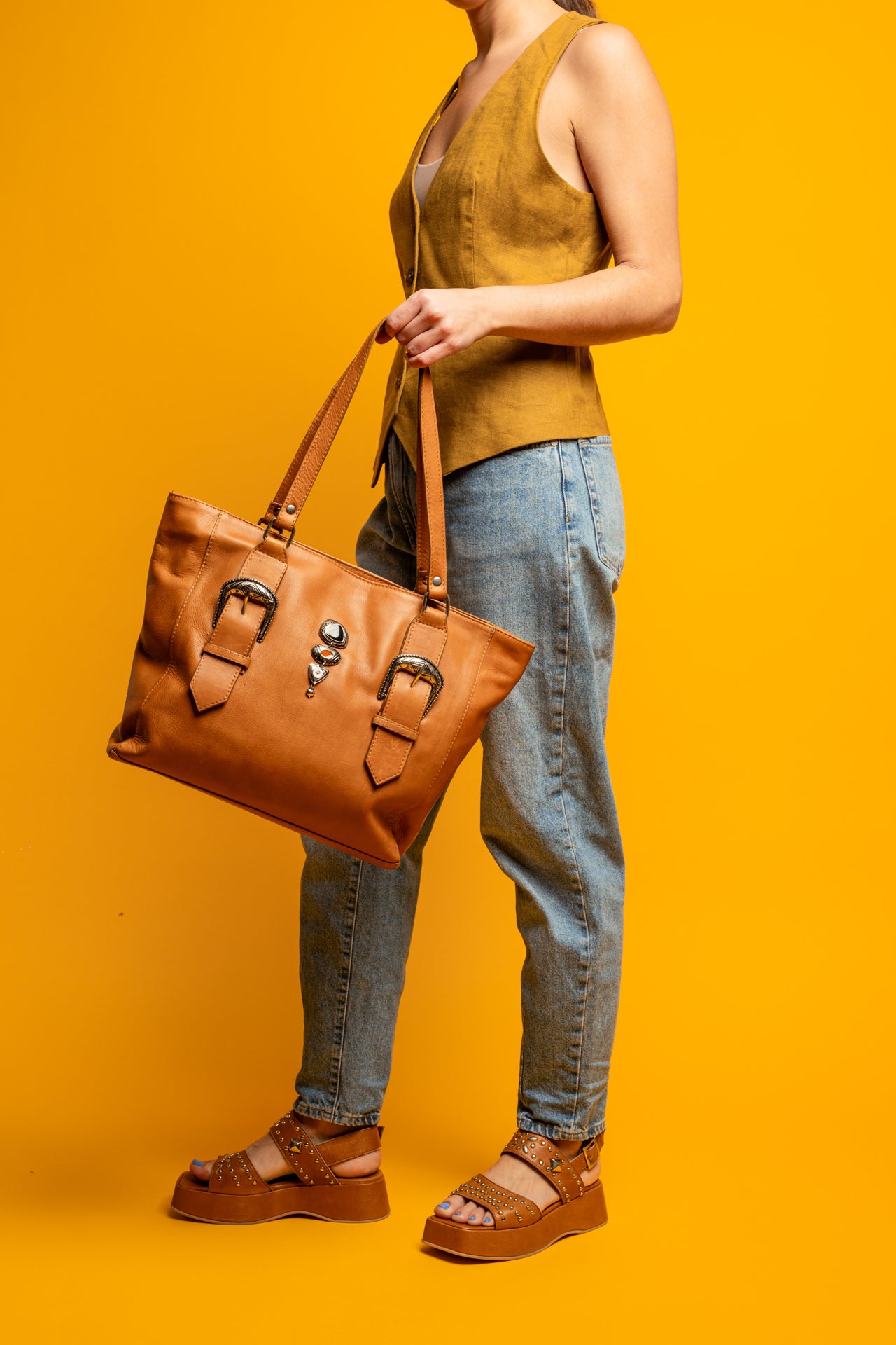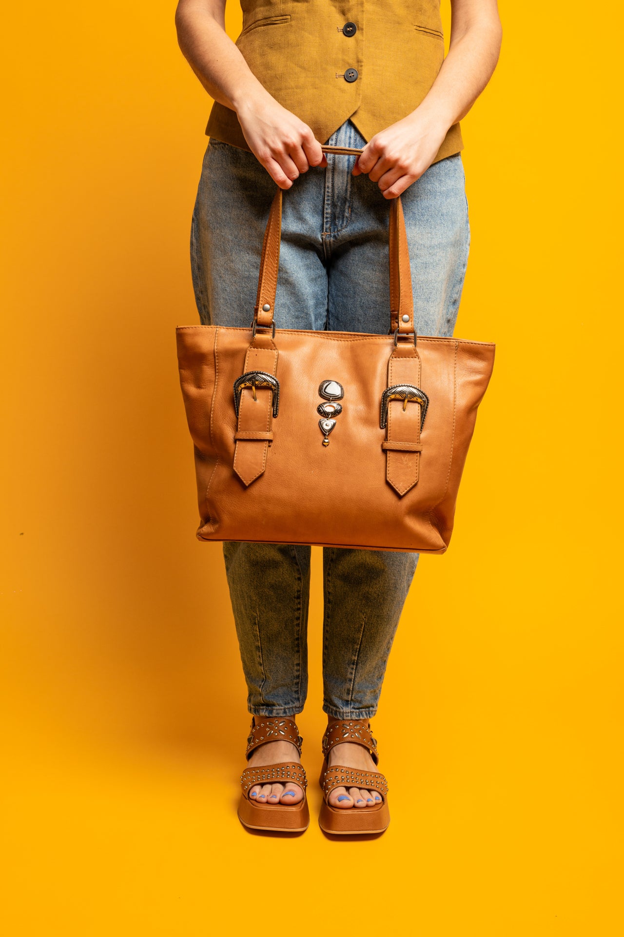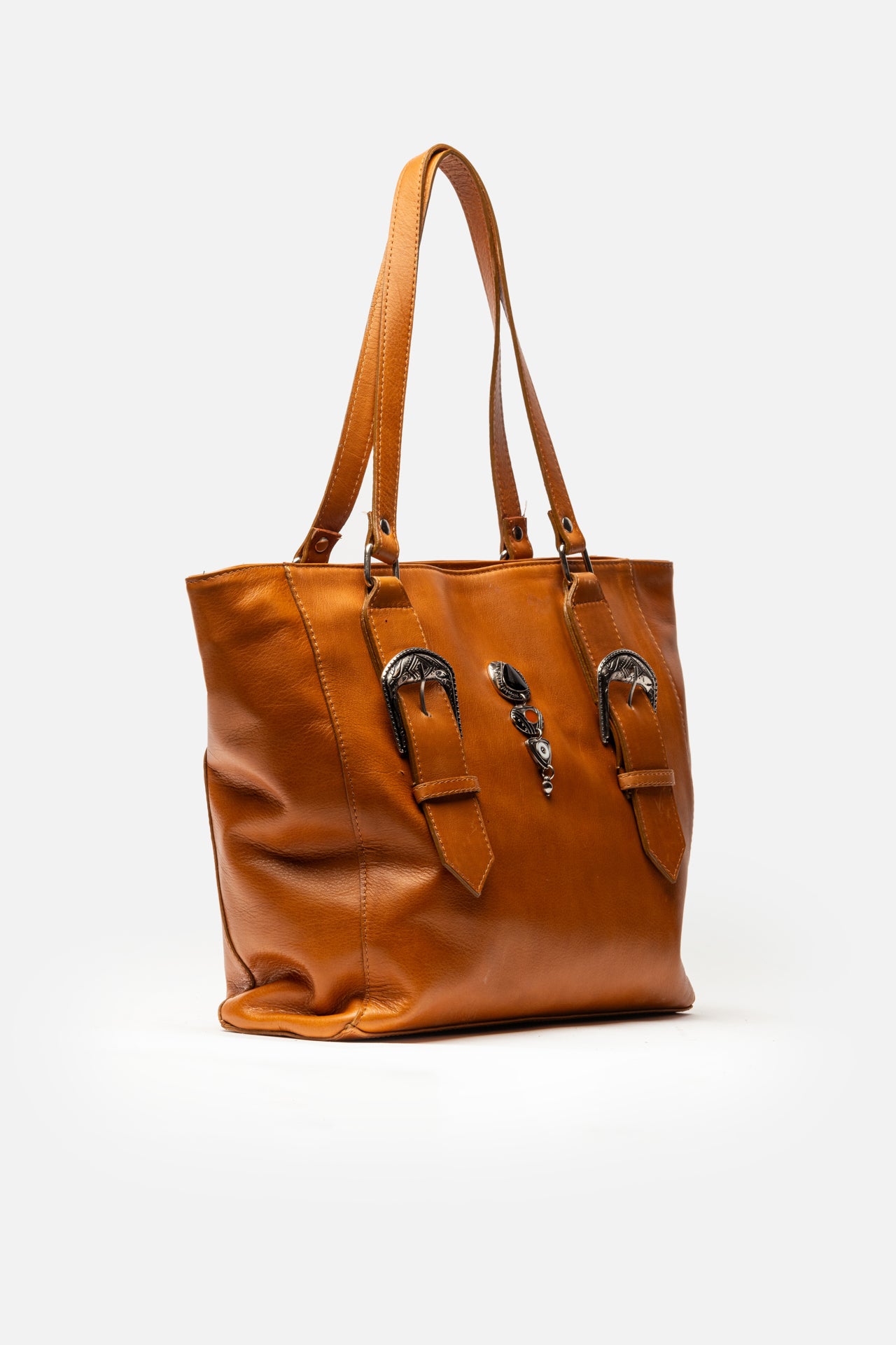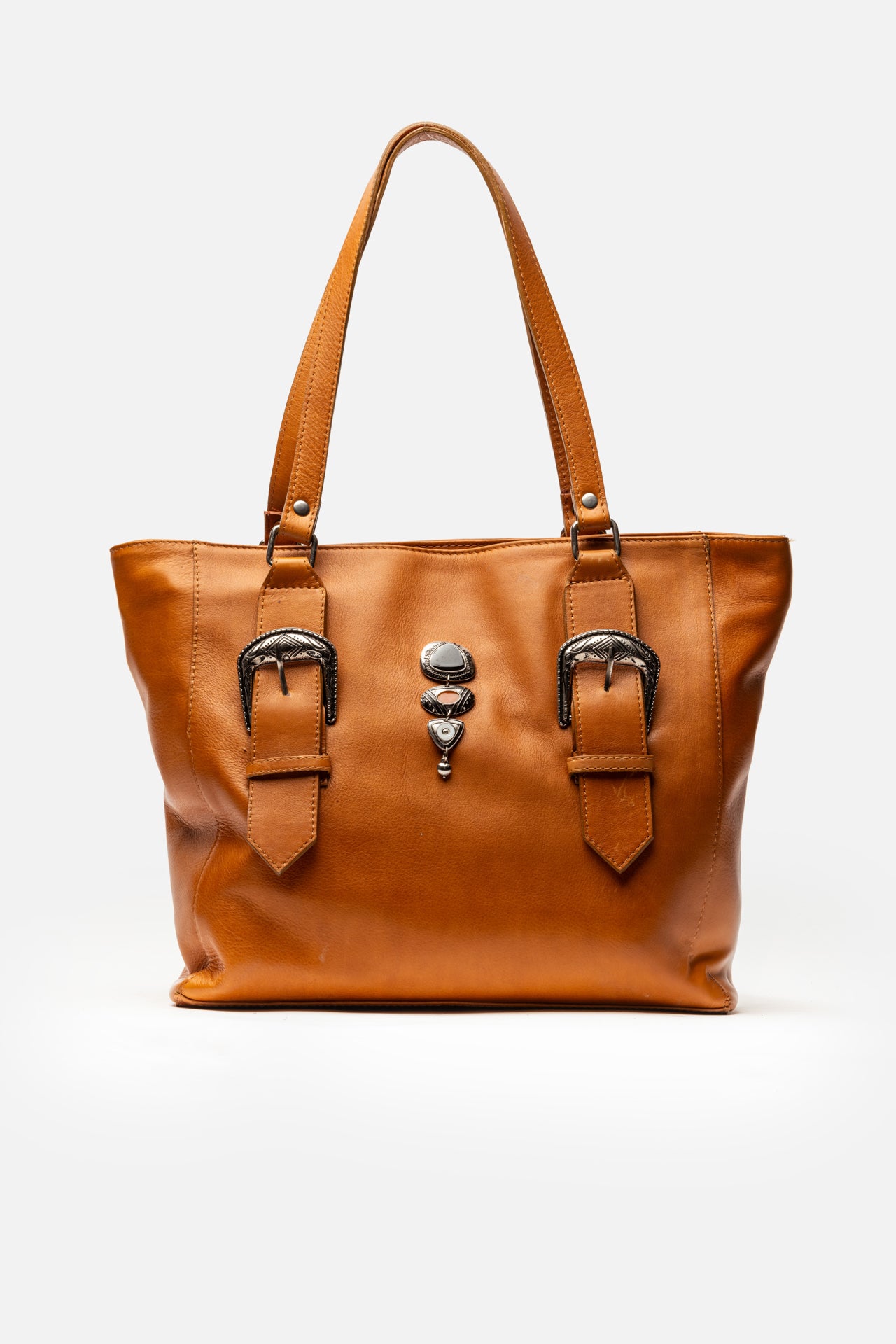 Crafted from premium leather with distinctive dual-buckle accents, spacious interior, and sturdy handles for everyday durability.