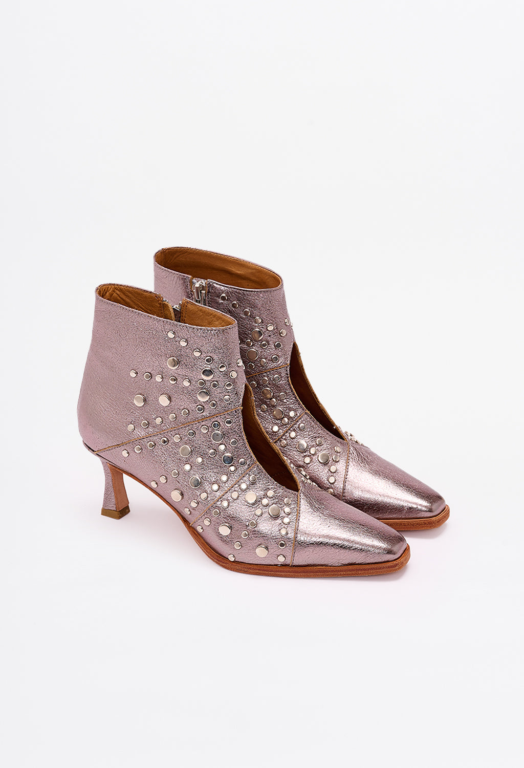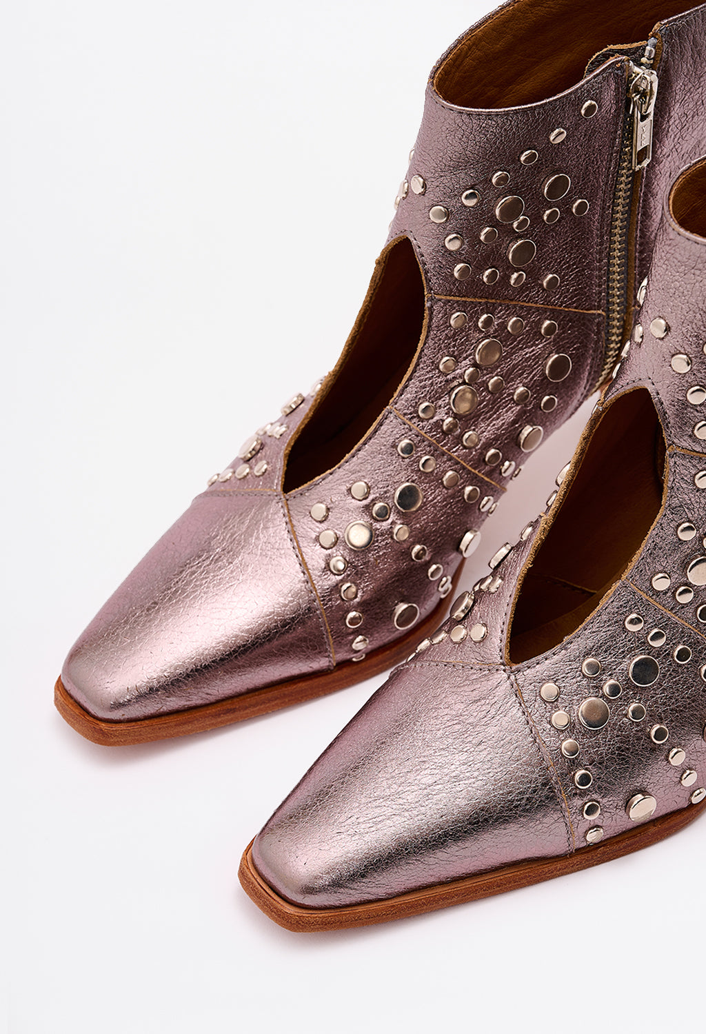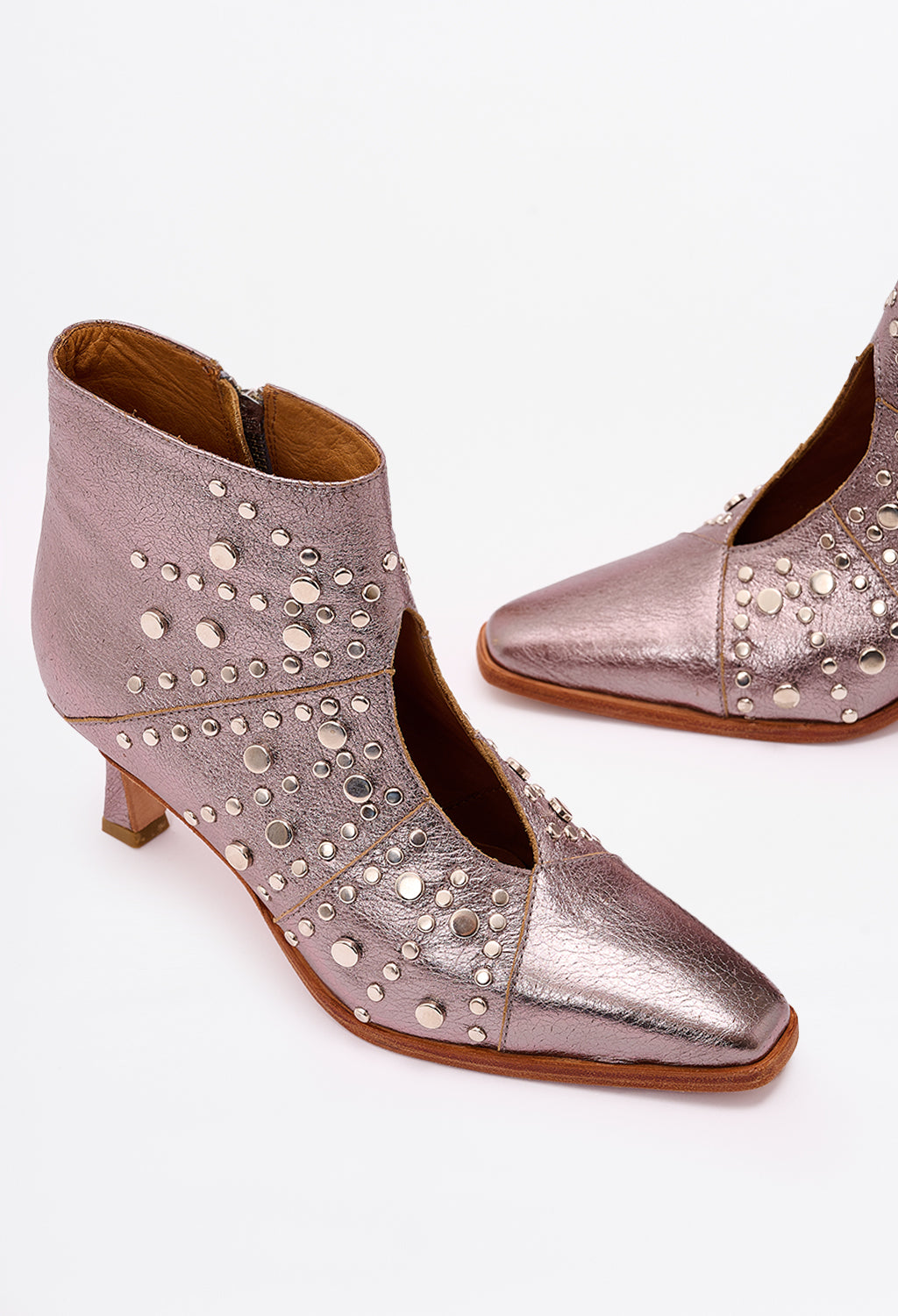 The "Of Course, Darling" ankle boot exudes avant-garde charm with open cut-outs and shimmering metallic detailing. Ideal for women seeking standout, artistic footwear.