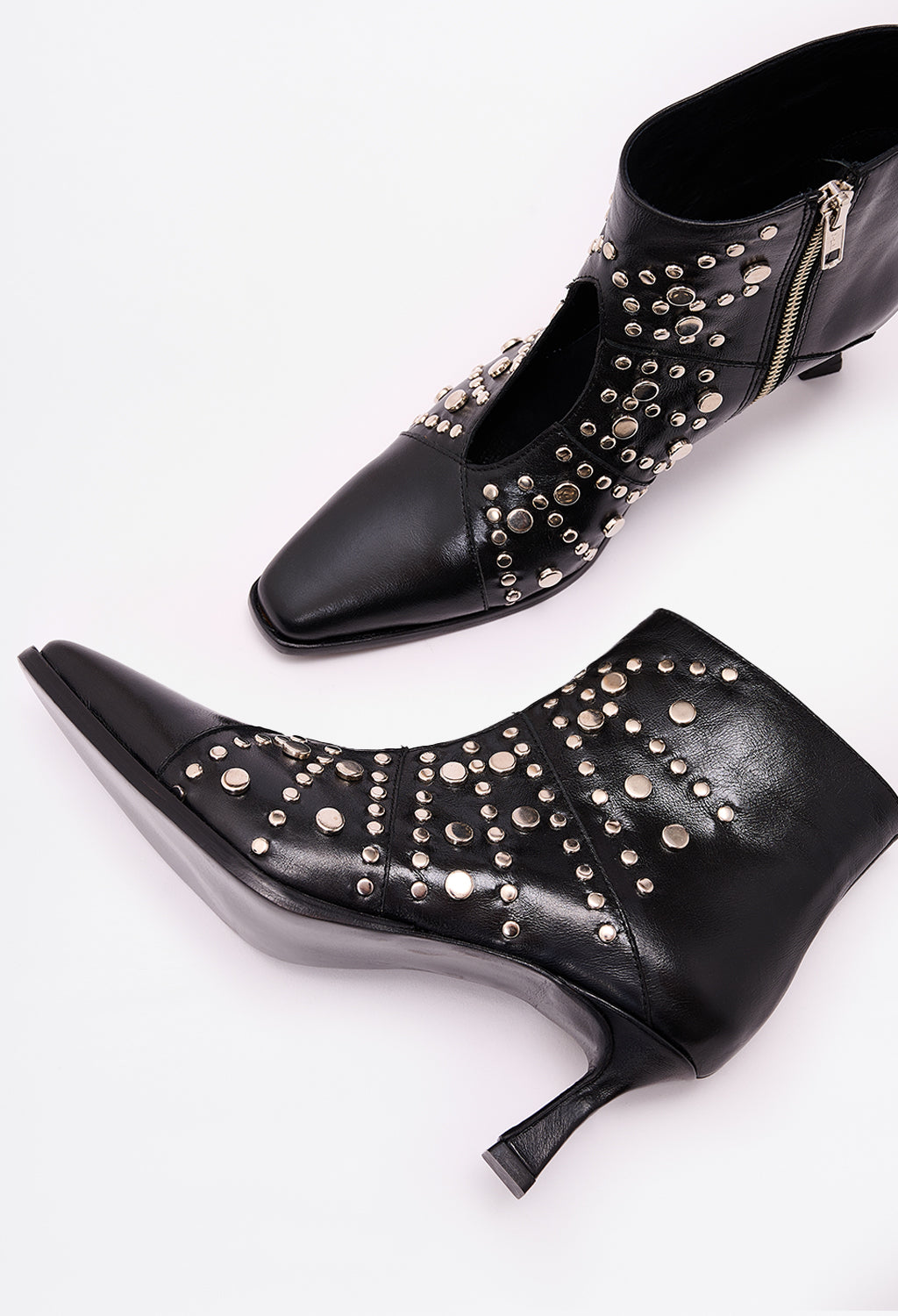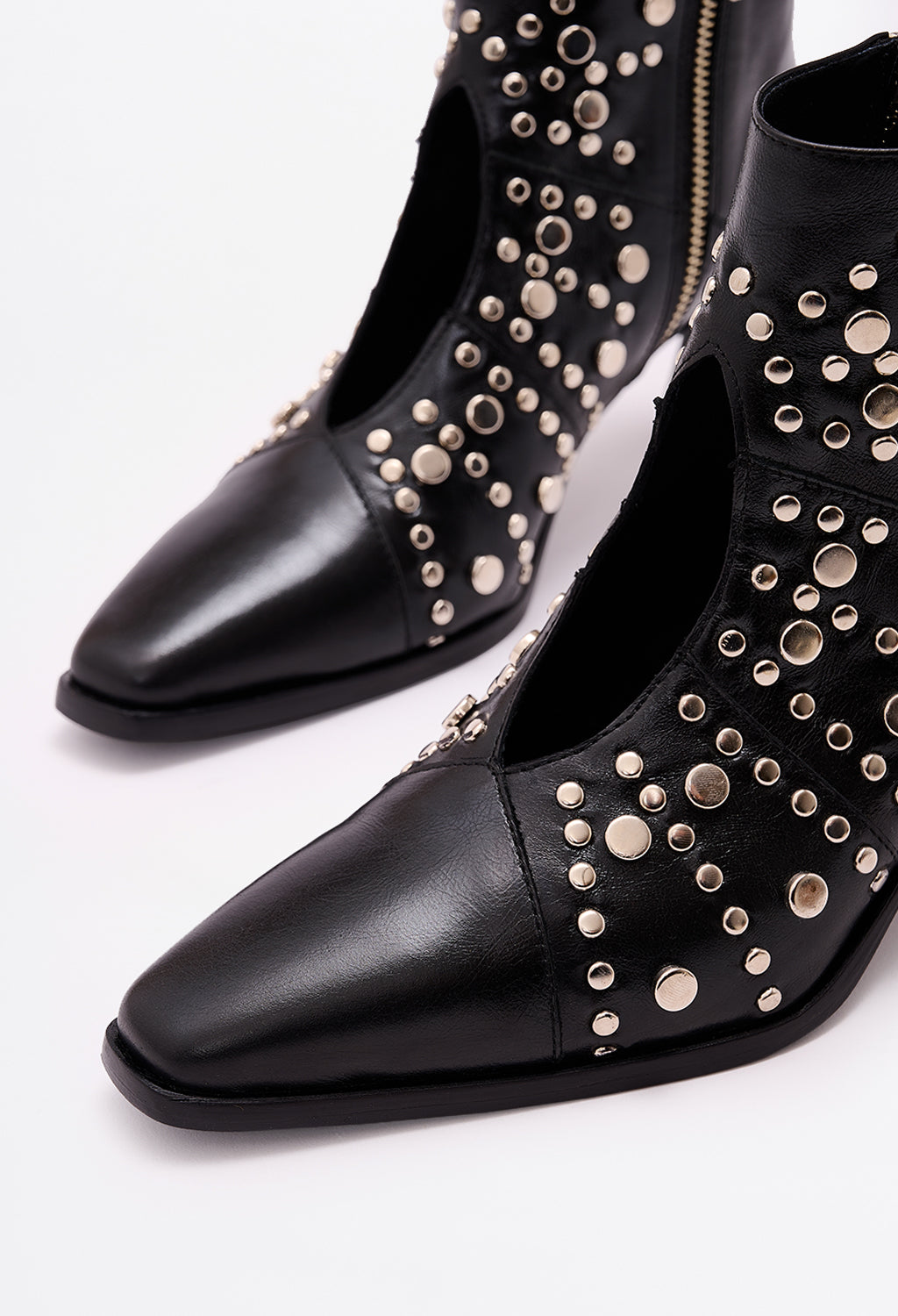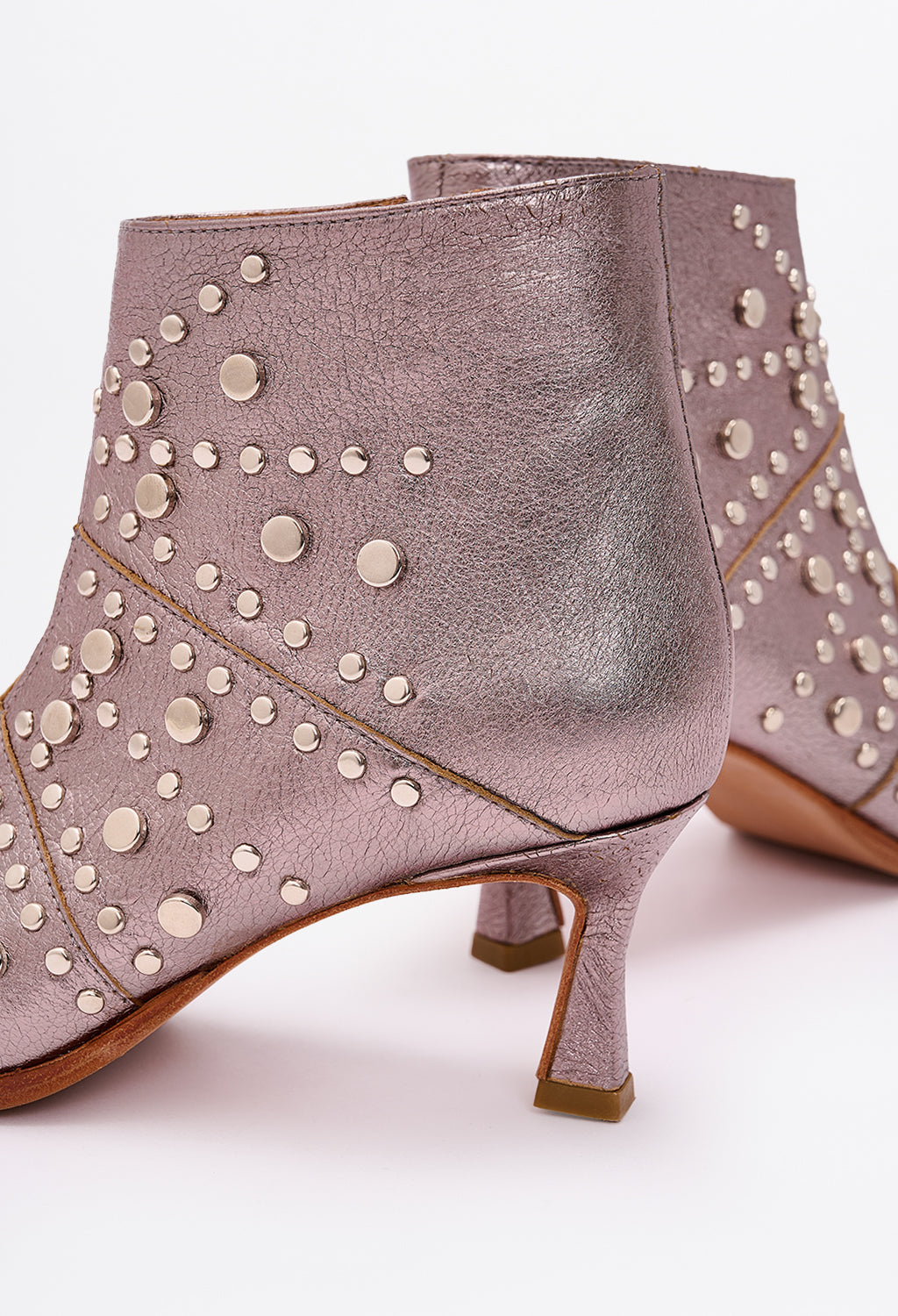 The "Of Course, Darling" ankle boot exudes avant-garde charm with open cut-outs and shimmering metallic detailing. Ideal for women seeking standout, artistic footwear.