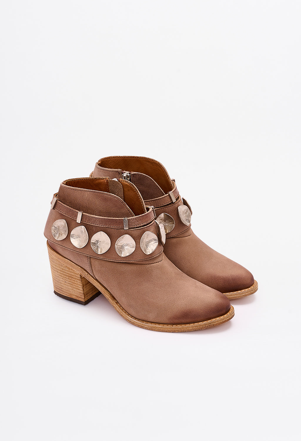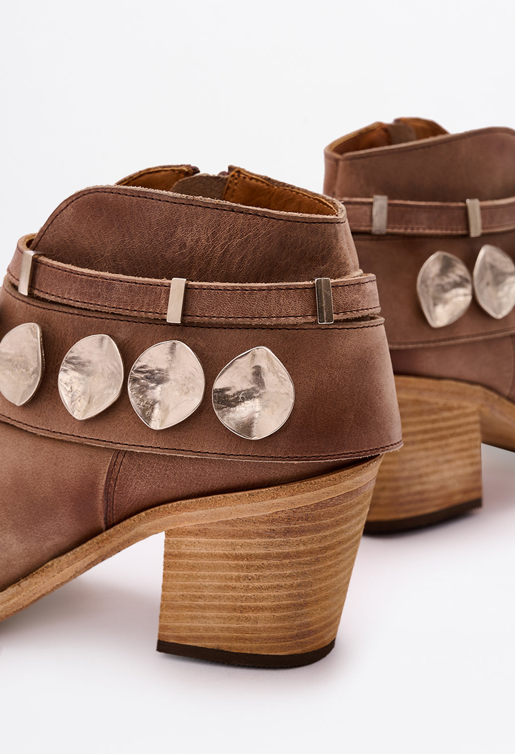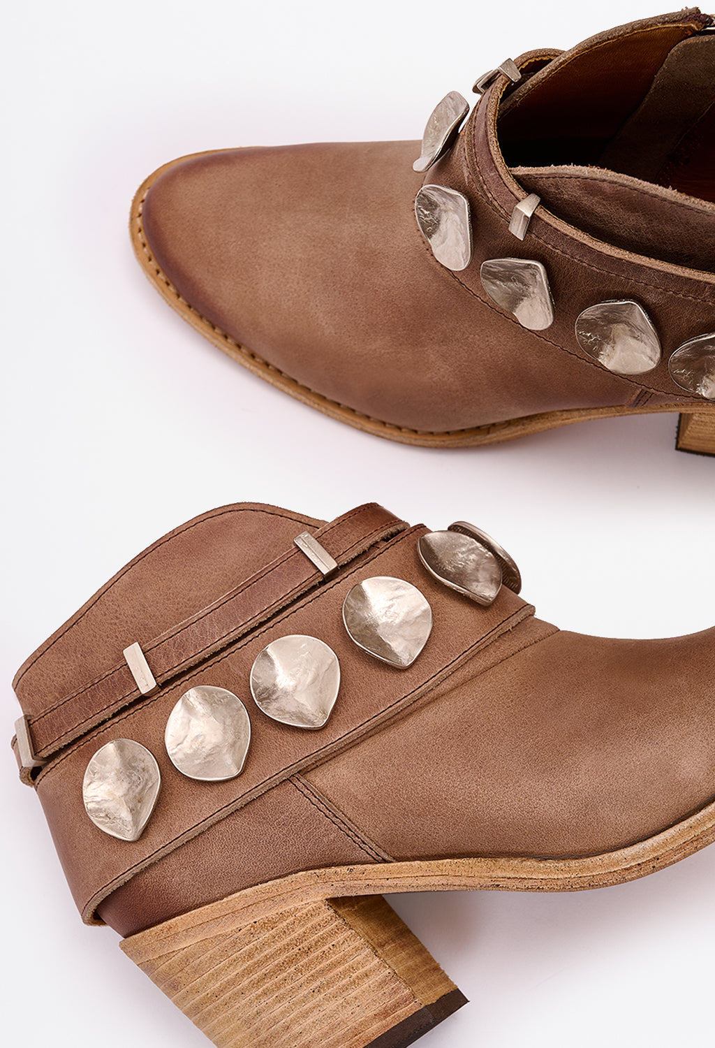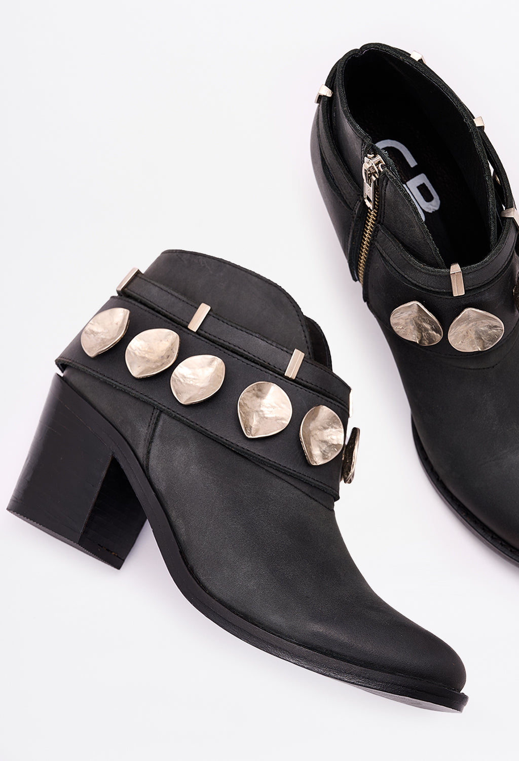 The "Sssssip" boot brings a blend of rustic charm and bold design. Available in Tan and Black. this boot features silver embellishments for a playful twist and a medium heel for stylish comfort.