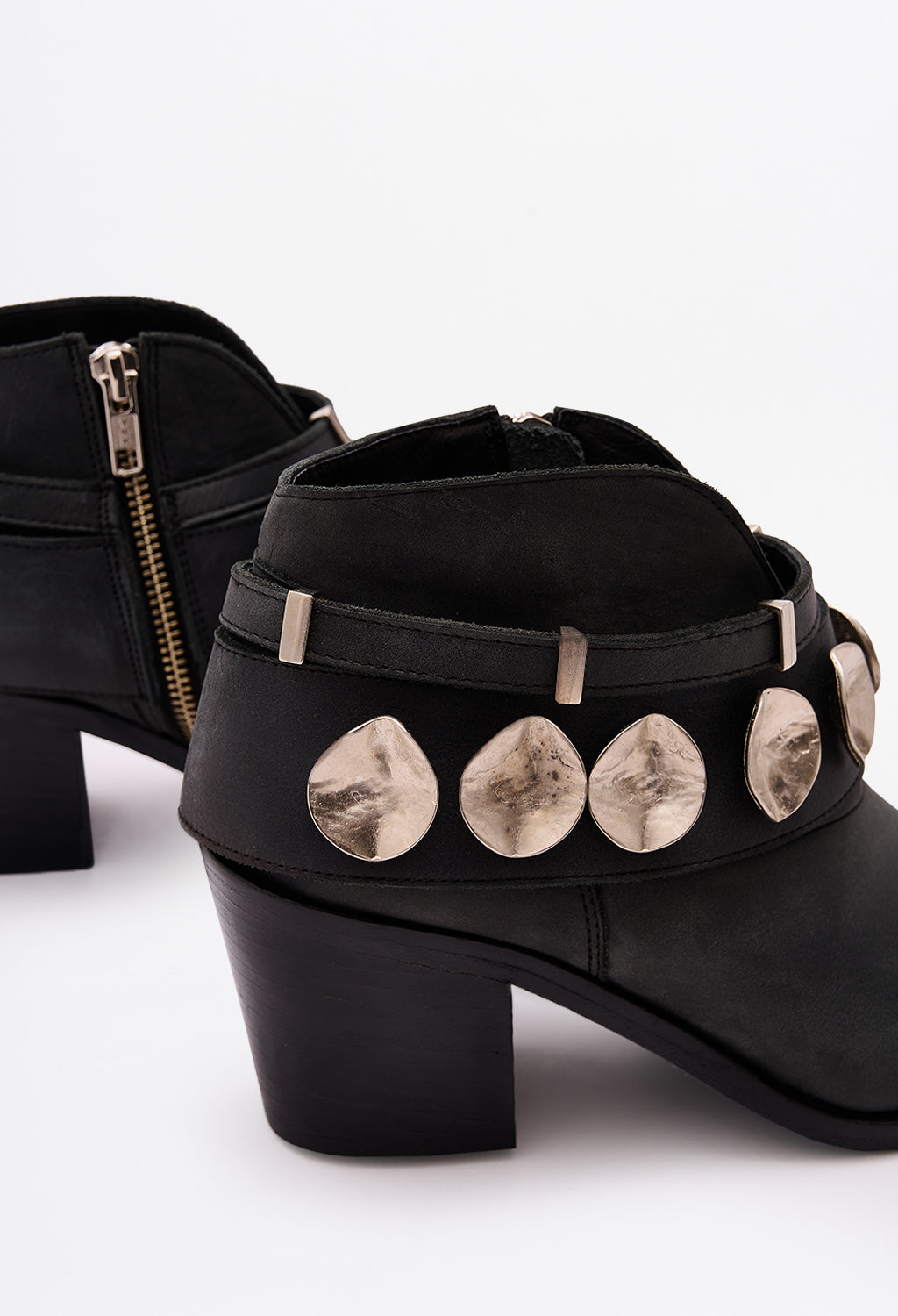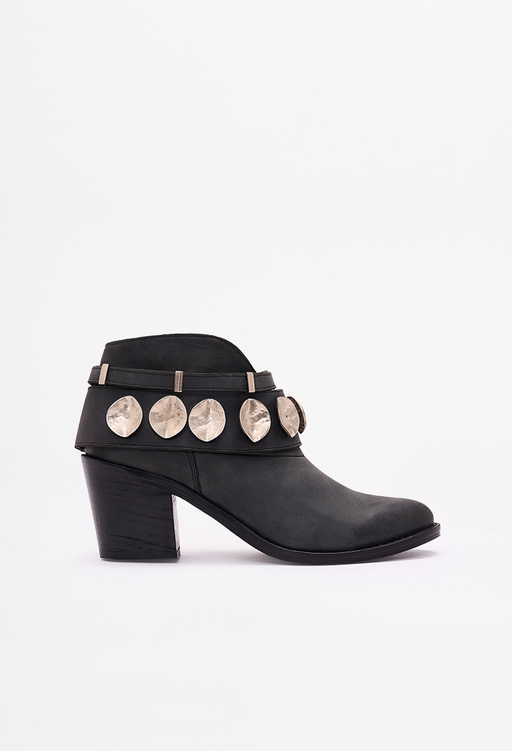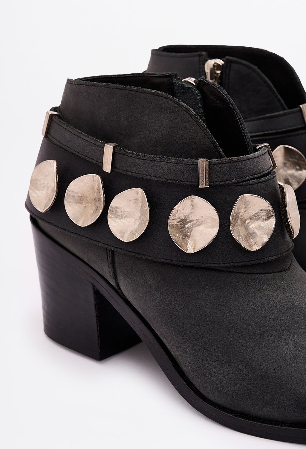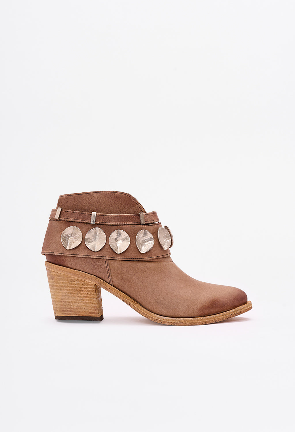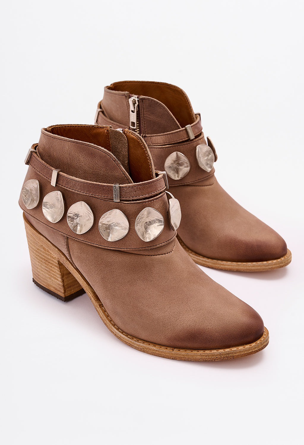 The "Sssssip" boot brings a blend of rustic charm and bold design. Available in Tan and Black. this boot features silver embellishments for a playful twist and a medium heel for stylish comfort.