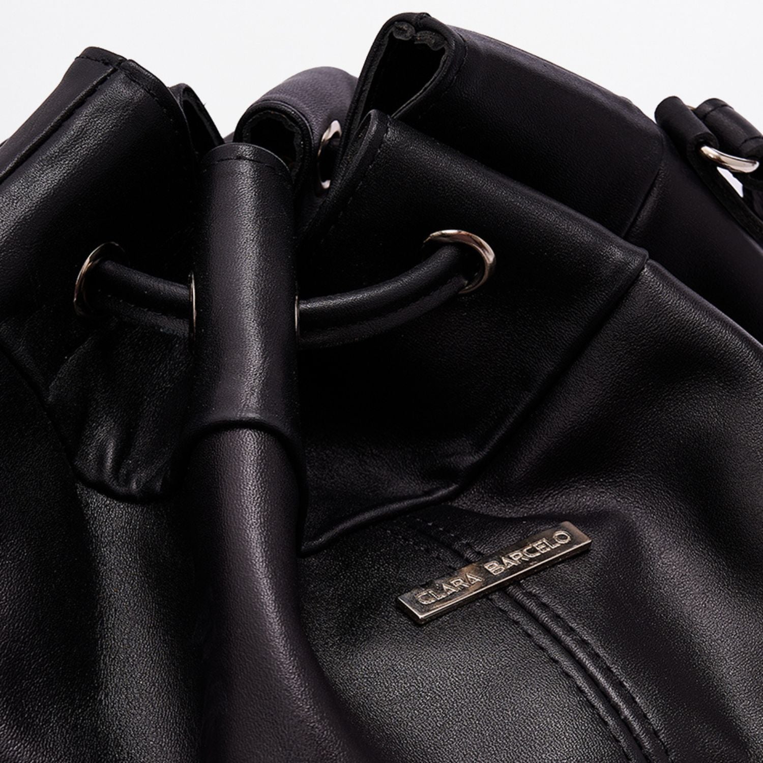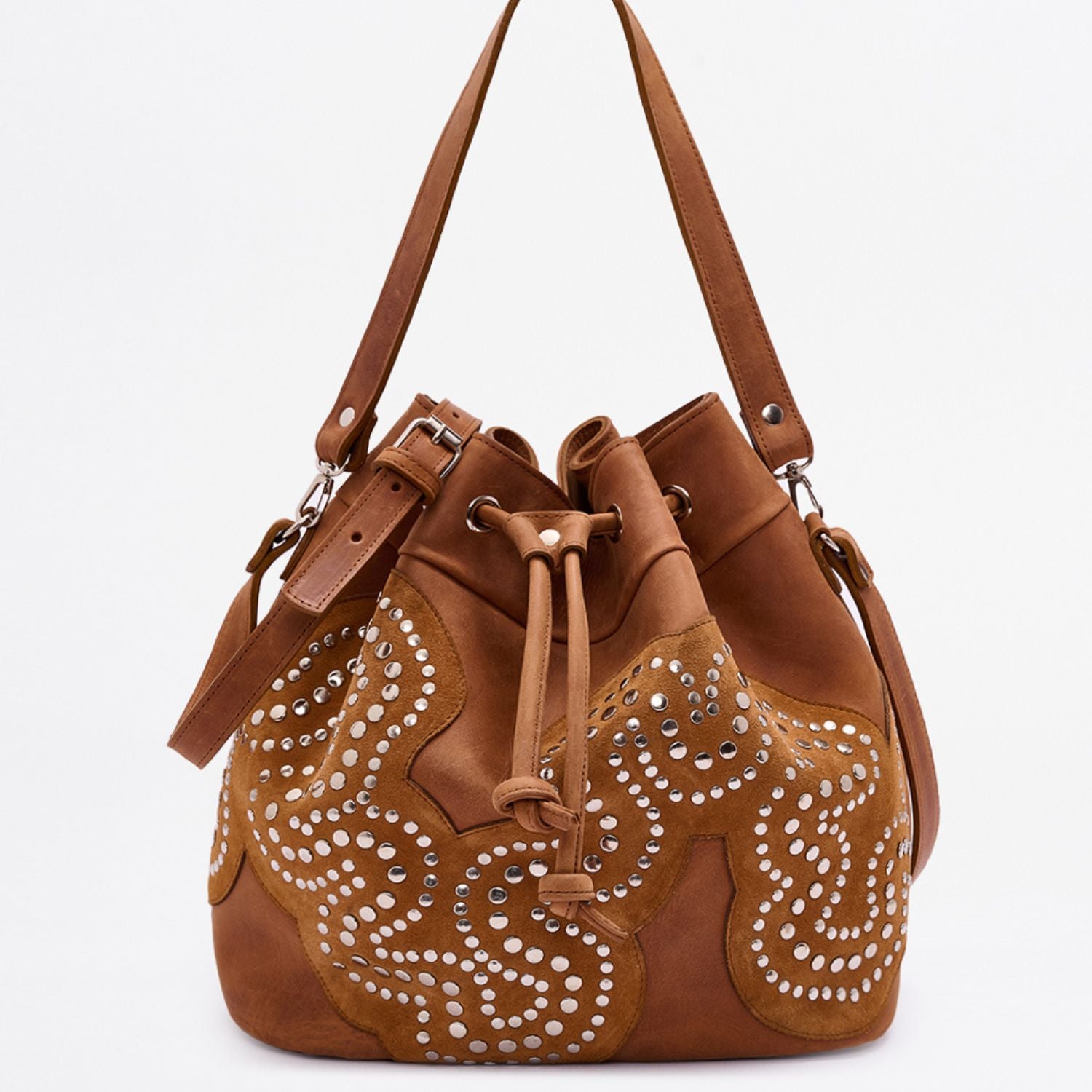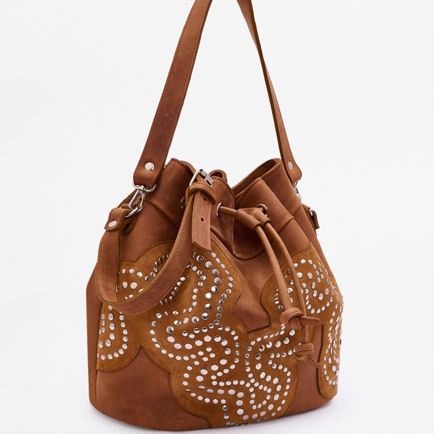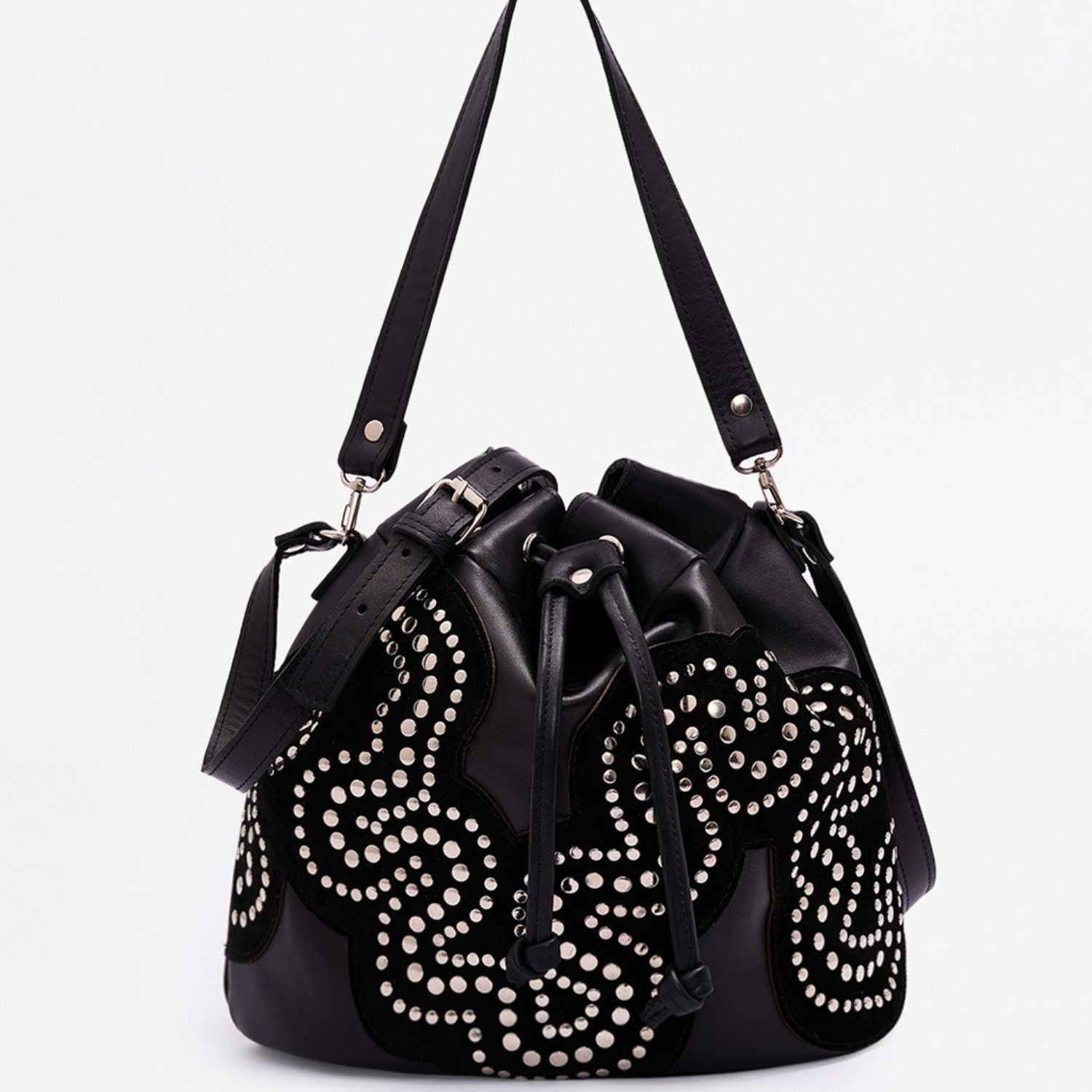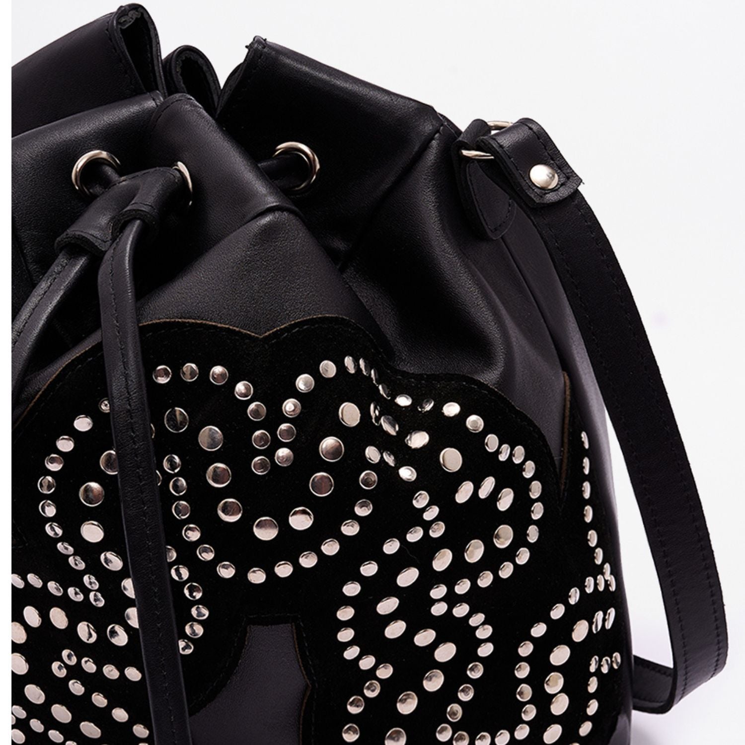 Studded bucket bag with swirling appliqué and an easy drawstring—small-batch statement with everyday ease.